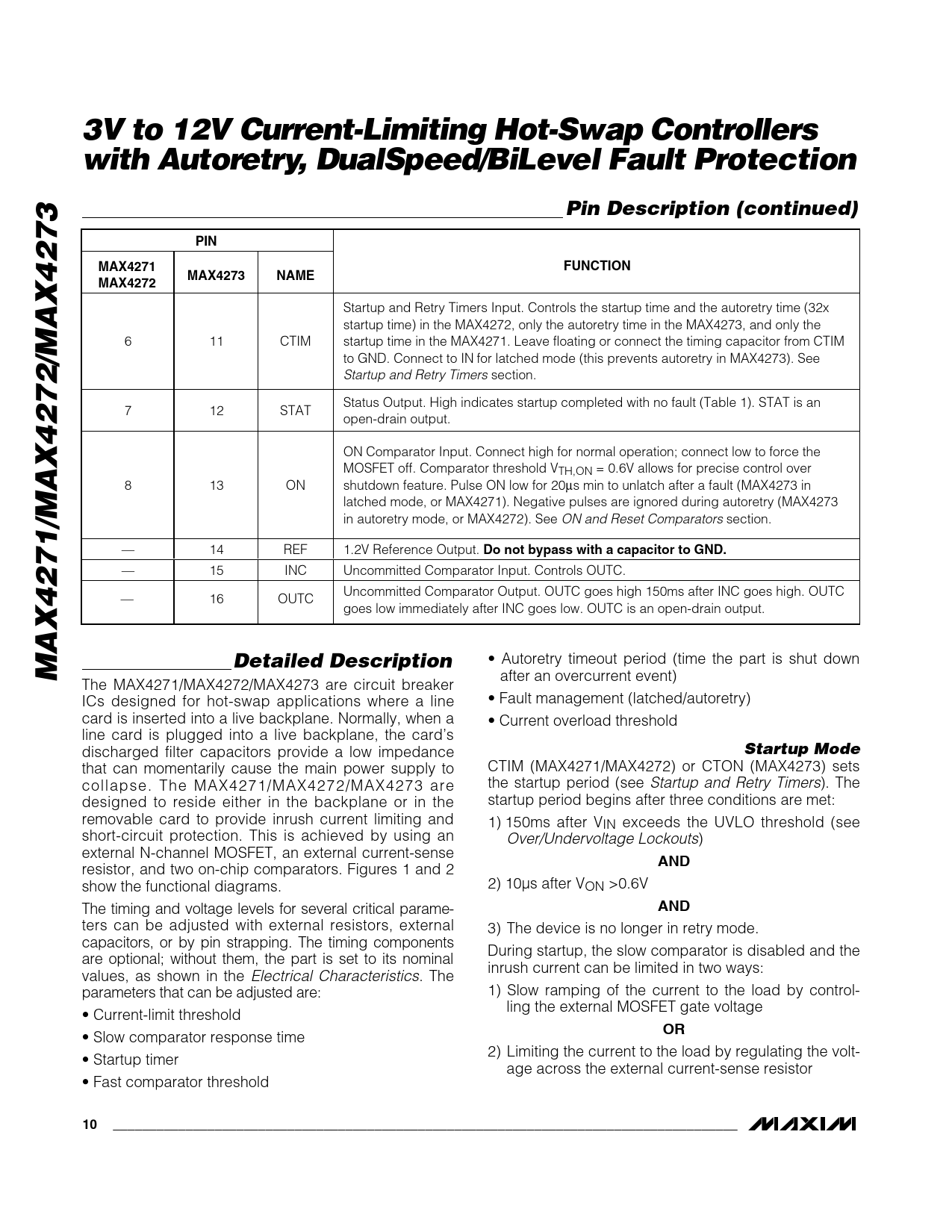 3V to 12V Current-Limiting Hot-Swap Controllers with Autoretry, DualSpeed/BiLevel Fault Protection Pin Description (continued) PIN MAX4271 FUNCTION MAX4273 NAME MAX4272