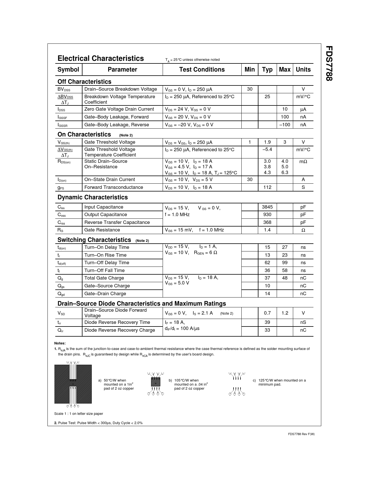 FDS Electrical Characteristics 7788 Symbol Parameter Test Conditions Min Typ Max Units Off Characteristics On Characteristics