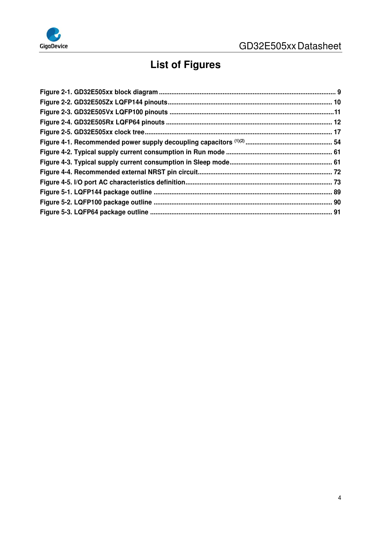 | Pages / Page | 95 / 5 — List of Figures. Figure 2-1. GD32E505xx block diagram .. 9. Figure 2-2. … |