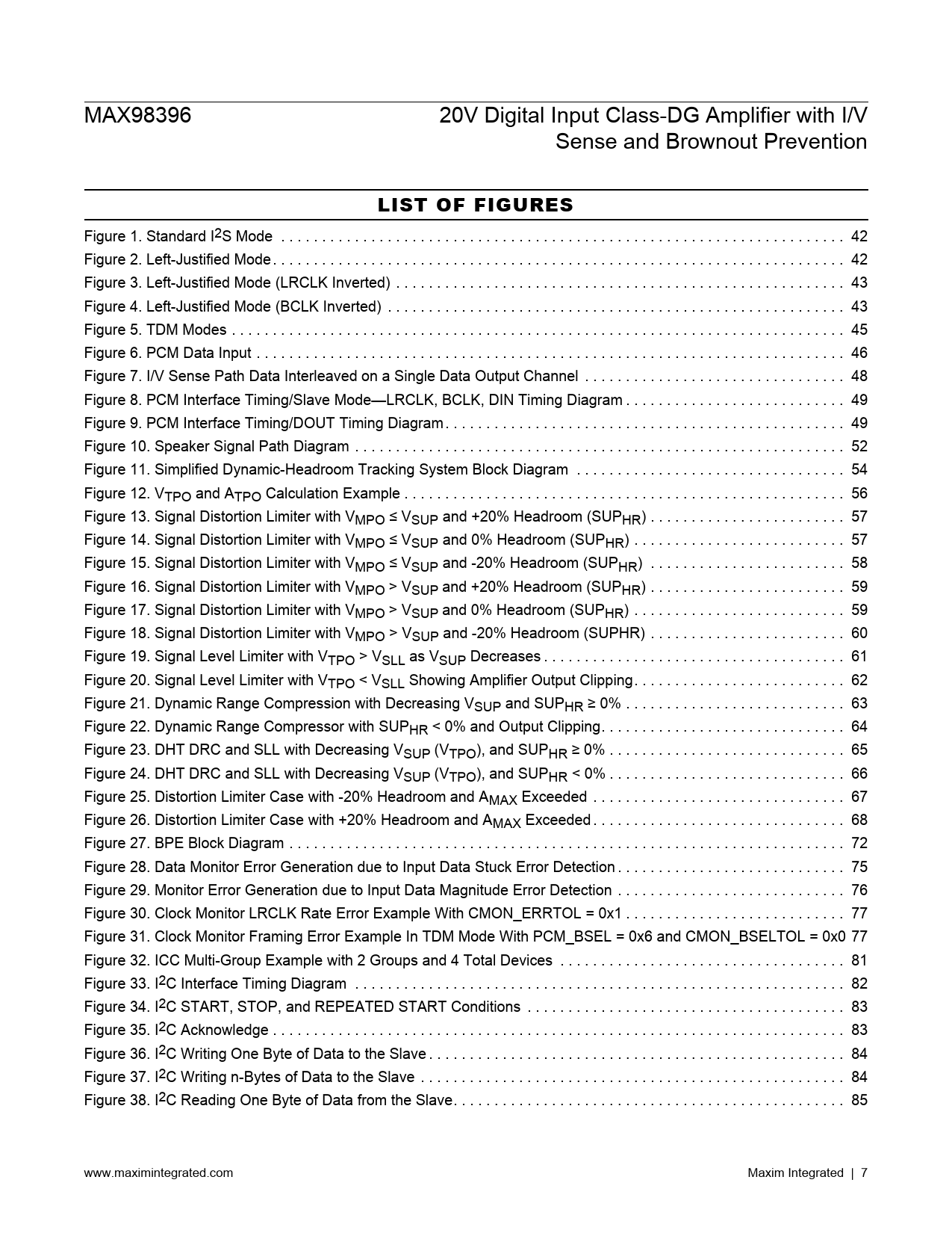 link to page 42 link to page 42 link to page 42 link to page 43 link to page 43 link to page 45 link to page 46 link to page 48 link to page 49 link to page 49 link to page 52 link to page 54 link to page 56 link to page 56 link to page 56 link to page 57 link to page 57 link to page 57 link to page 57 link to page 57 link to page 57 link to page 57 link to page 57 link to page 58 link to page 58 link to page 58 link to page 58 link to page 59 link to page 59 link to page 59 link to page 59 link to page 59 link to page 59 link to page 59 link to page 59 link to page 60 link to page 60 link to page 60 link to page 61 link to page 61 link to page 61 link to page 61 link to page 62 link to page 62 link to page 62 link to page 63 link to page 63 link to page 63 link to page 64 link to page 64 link to page 65 link to page 65 link to page 65 link to page 65 link to page 66 link to page 66 link to page 66 link to page 66 link to page 67 link to page 67 link to page 68 link to page 68 link to page 72 link to page 75 link to page 76 link to page 77 link to page 77 link to page 81 link to page 82 link to page 82 link to page 83 link to page 83 link to page 83 link to page 83 link to page 84 link to page 84 link to page 84 link to page 84 link to page 85 link to page 85 MAX98396 20V Digital Input Class-DG Amplifier with I/V Sense and Brownout Prevention LIST OF FIGURES Figure 1. Standard I2S Mode . 42 Figure 2. Left-Justified Mode . 42 Figure 3. Left-Justified Mode (LRCLK Inverted) . 43 Figure 4. Left-Justified Mode (BCLK Inverted) . 43 Figure 5. TDM Modes . 45 Figure 6. PCM Data Input . 46 Figure 7. I/V Sense Path Data Interleaved on a Single Data Output Channel . 48 Figure 8. PCM Interface Timing/Slave Mode—LRCLK, BCLK, DIN Timing Diagram . 49 Figure 9. PCM Interface Timing/DOUT Timing Diagram . 49 Figure 10. Speaker Signal Path Diagram . 52 Figure 11. Simplified Dynamic-Headroom Tracking System Block Diagram . 54 Figure 12. VTPO and ATPO Calculation Example . 56 Figure 13. Signal Distortion Limiter with VMPO ≤ VSUP and +20% Headroom (SUPHR) . 57 Figure 14. Signal Distortion Limiter with VMPO ≤ VSUP and 0% Headroom (SUPHR) . 57 Figure 15. Signal Distortion Limiter with VMPO ≤ VSUP and -20% Headroom (SUPHR) . 58 Figure 16. Signal Distortion Limiter with VMPO > VSUP and +20% Headroom (SUPHR) . 59 Figure 17. Signal Distortion Limiter with VMPO > VSUP and 0% Headroom (SUPHR) . 59 Figure 18. Signal Distortion Limiter with VMPO > VSUP and -20% Headroom (SUPHR) . 60 Figure 19. Signal Level Limiter with VTPO > VSLL as VSUP Decreases . 61 Figure 20. Signal Level Limiter with VTPO < VSLL Showing Amplifier Output Clipping . 62 Figure 21. Dynamic Range Compression with Decreasing VSUP and SUPHR ≥ 0% . 63 Figure 22. Dynamic Range Compressor with SUPHR < 0% and Output Clipping . 64 Figure 23. DHT DRC and SLL with Decreasing VSUP (VTPO), and SUPHR ≥ 0% . 65 Figure 24. DHT DRC and SLL with Decreasing VSUP (VTPO), and SUPHR < 0% . 66 Figure 25. Distortion Limiter Case with -20% Headroom and AMAX Exceeded . 67 Figure 26. Distortion Limiter Case with +20% Headroom and AMAX Exceeded . 68 Figure 27. BPE Block Diagram . 72 Figure 28. Data Monitor Error Generation due to Input Data Stuck Error Detection . 75 Figure 29. Monitor Error Generation due to Input Data Magnitude Error Detection . 76 Figure 30. Clock Monitor LRCLK Rate Error Example With CMON_ERRTOL = 0x1 . 77 Figure 31. Clock Monitor Framing Error Example In TDM Mode With PCM_BSEL = 0x6 and CMON_BSELTOL = 0x0 77 Figure 32. ICC Multi-Group Example with 2 Groups and 4 Total Devices . 81 Figure 33. I2C Interface Timing Diagram . 82 Figure 34. I2C START, STOP, and REPEATED START Conditions . 83 Figure 35. I2C Acknowledge . 83 Figure 36. I2C Writing One Byte of Data to the Slave . 84 Figure 37. I2C Writing n-Bytes of Data to the Slave . 84 Figure 38. I2C Reading One Byte of Data from the Slave . 85 www.maximintegrated.com Maxim Integrated | 7 Document Outline General Description Applications Benefits and Features Simplified Block Diagram Absolute Maximum Ratings Package Information 35 WLP Electrical Characteristics Electrical Characteristics (continued) Typical Operating Characteristics Typical Operating Characteristics (continued) Pin Configuration 35 WLP Pin Description Pin Description (continued) Functional Diagrams Detailed Block Diagram Detailed Description Device State Control Hardware Shutdown State Software Shutdown State Active State Device Sequencing PCM Interface PCM Clock Configuration PCM Data Format Configuration I2S/Left-Justified Mode TDM Modes PCM Data Path Configuration PCM Data Input PCM Data Output Data Output Channel-Interleaved I/V Sense Data Data Output Status Bits PCM Interface Timing Interrupts Interrupt Bit Field Composition Interrupt Output Configuration Interrupt Sources Speaker Path Speaker Path Block Diagram Speaker Playback Path Speaker Path Noise Gate Speaker Path Dither Speaker Path Data Inversion Speaker Path DC Blocking Filter Speaker Path Digital Volume Control Speaker Path Digital Gain Control Speaker Path DSP Data Feedback Path Speaker Safe Mode Speaker Audio Processing Bypass Path Bypass Path Data Inversion Bypass Path Dither Bypass Path DC Blocking Filter Speaker Maximum Peak Output Voltage Scaling Dynamic-Headroom Tracking (DHT) DHT Supply Tracking and Headroom DHT Mode 1 – Signal Distortion Limiter DHT Mode 2 – Signal Level Limiter DHT Mode 3: Dynamic Range Compressor DHT Mode 4: Dynamic Range Compressor with Signal Level Limiter DHT Attenuation DHT Attenuation Reporting DHT Ballistics Speaker Amplifier Speaker Amplifier Operating Modes Class-DG Mode Enabled Delay for DG Mode Class-DG Mode Disabled NOVBAT Mode IDLE Mode Speaker Amplifier Ultra-Low EMI Filterless Operation Speaker Amplifier Overcurrent Protection Speaker Current and Voltage Sense ADC Path Brownout-Prevention Engine BPE State Controller and Level Thresholds BPE Level Configuration Options BPE Gain Attenuation Function BPE Limiter Function Brow
