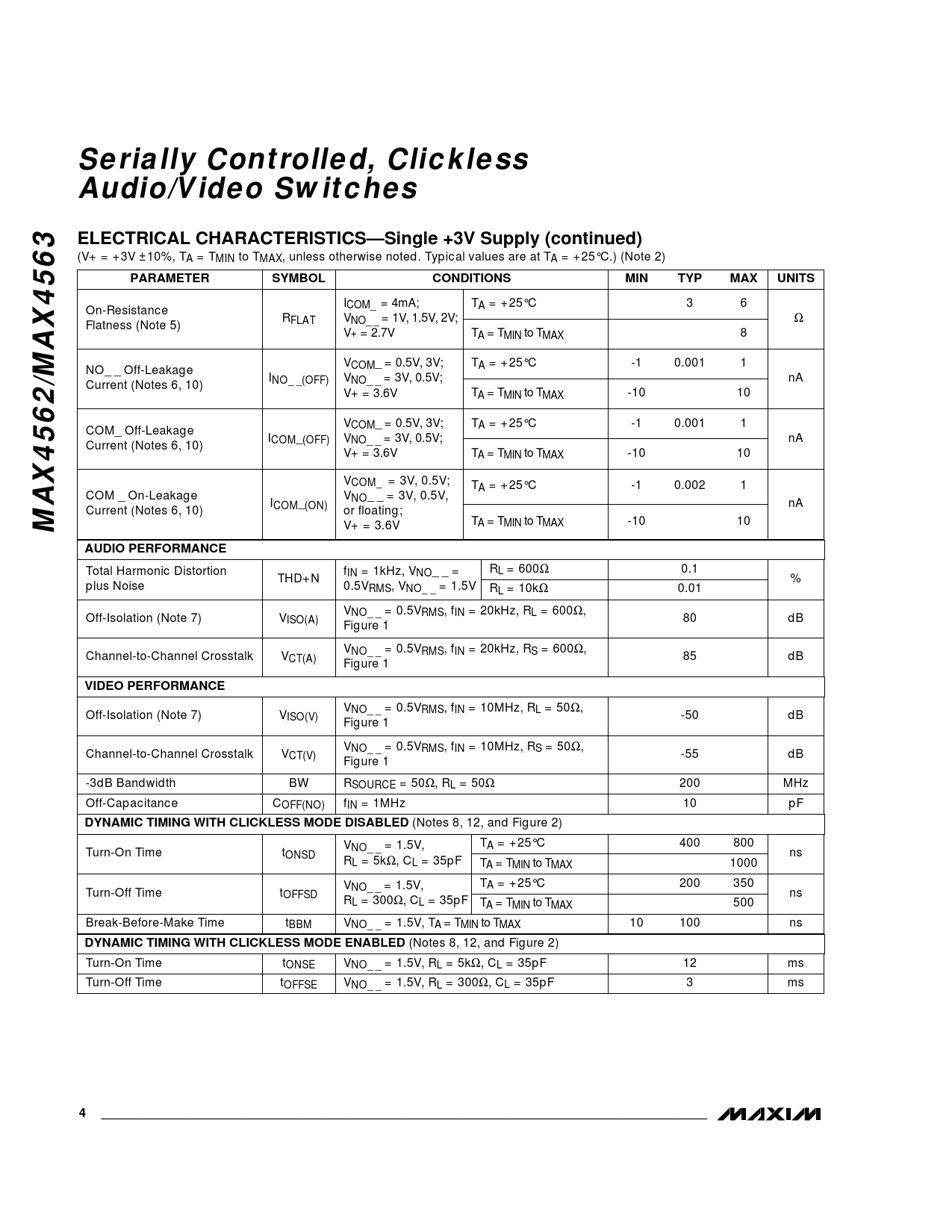 Serially Controlled, Clickless Audio/Video Switches. ELECTRICAL CHARACTERISTICS—Single +3V Supply (continued). PARAMETER