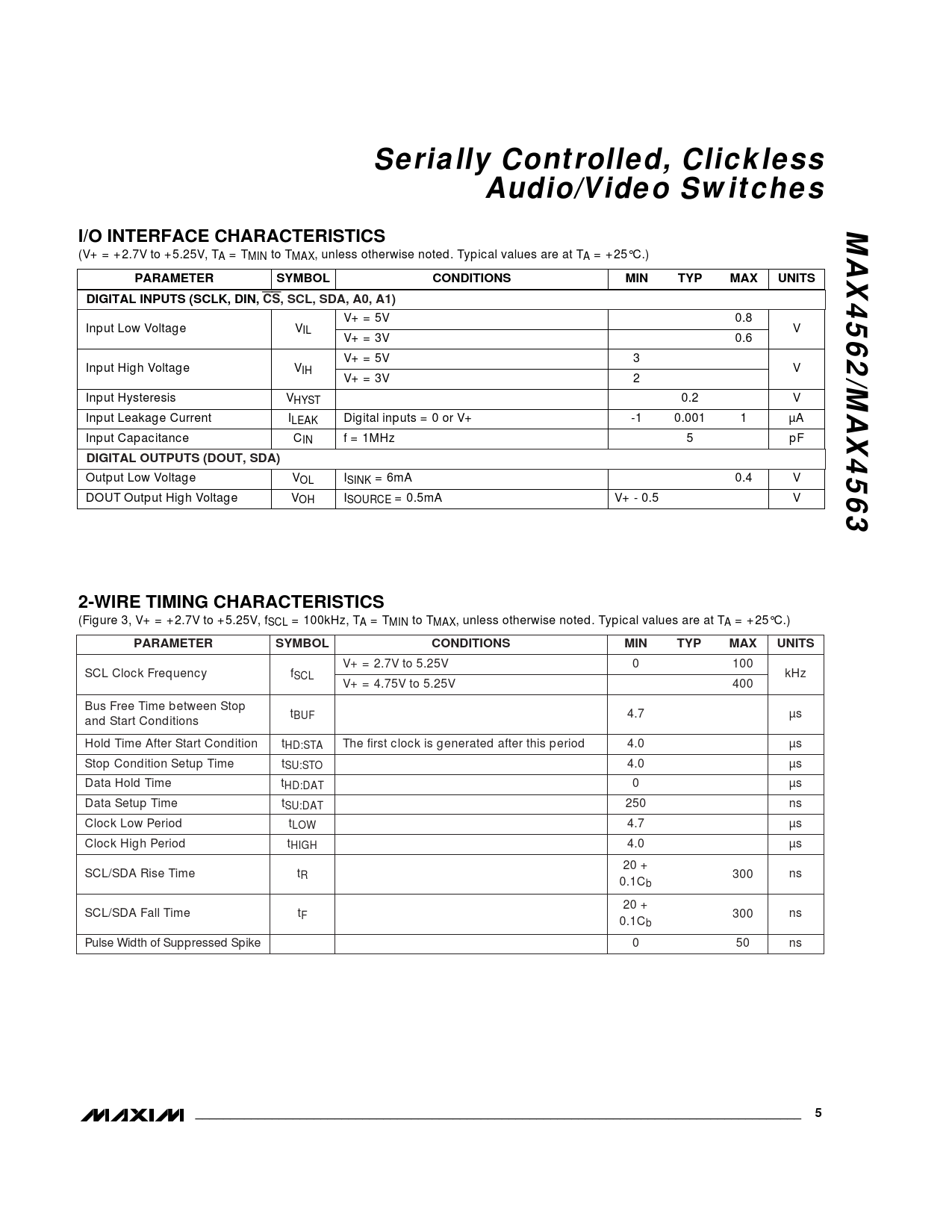 Serially Controlled, Clickless Audio/Video Switches MAX4562/MAX4563 I/O INTERFACE CHARACTERISTICS PARAMETER SYMBOL CONDITIONS