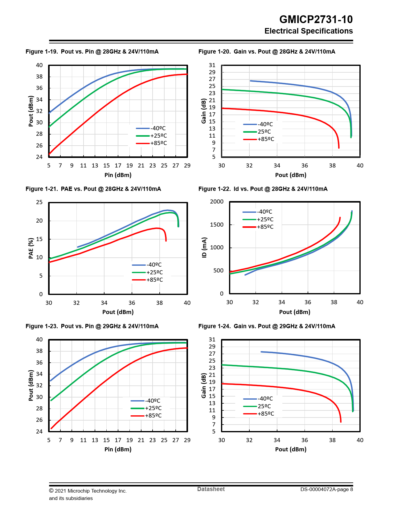 GMICP2731-10 Electrical Specifications Figure 1-19. Pout vs. Pin @ 28GHz & 24V/110mA Figure 1-20. Gain vs. Pout @ 28GHz & 24V/110mA