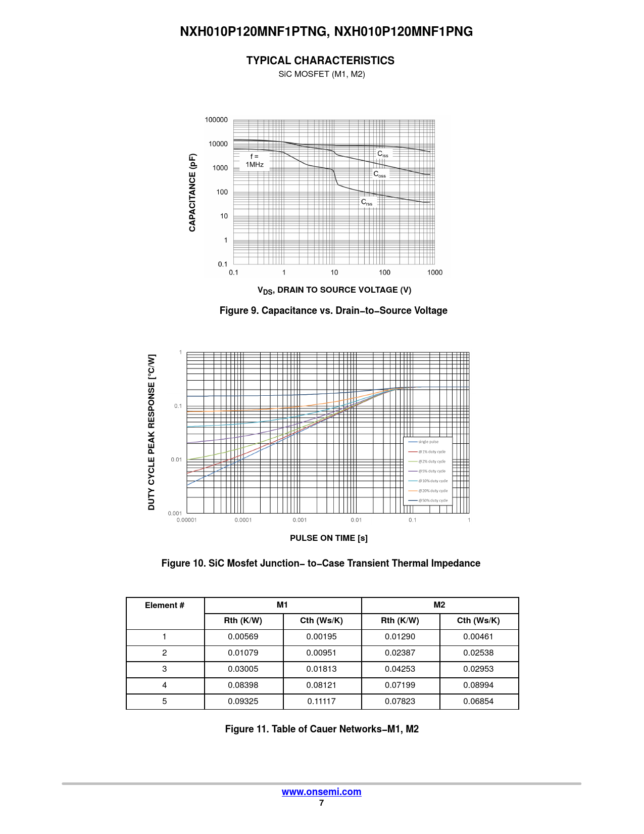 C/W] DUTY CYCLE PEAK RESPONSE [ PULSE ON TIME [s] Figure 10. SiC Mosfet Junction− to−Case Transient Thermal Impedance Element # M1 M2 Rth (K/W) Cth (Ws/K) Rth (K/W) Cth (Ws/K)