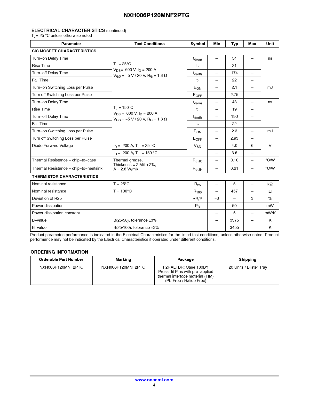 NXH006P120MNF2PTGELECTRICAL CHARACTERISTICS (continued) TJ = 25 °C unless otherwise noted ParameterTest ConditionsSymbolMinTypMaxUnitSiC MOSFET CHARACTERISTICS Turn−on Delay Time td(on) – 54 – ns TJ = 25°C Rise Time tr – 21 – VDS= 600 V, ID = 200 A Turn−off Delay Time t V d(off) – 174 – GS = −5 V / 20 V, RG = 1.8 W Fall Time tf – 22 – Turn−on Switching Loss per Pulse EON – 2.1 – mJ Turn off Switching Loss per Pulse EOFF – 2.75 – Turn−on Delay Time td(on) – 48 – ns TJ = 150°C Rise Time tr – 19 – VDS = 600 V, ID = 200 A Turn−off Delay Time t V d(off) – 196 – GS = −5 V / 20 V, RG = 1.8 W Fall Time tf – 22 – Turn−on Switching Loss per Pulse EON – 2.3 – mJ Turn off Switching Loss per Pulse EOFF – 2.93 – Diode Forward Voltage ID = 200 A , TJ = 25 °C VSD – 4.0 6 V ID = 200 A , TJ = 150 °C – 3.6 – Thermal Resistance − chip−to−case Thermal grease, RthJC – 0.10 – °C/W Thickness = 2 Mil +2%, Thermal Resistance − chip−to−heatsink A = 2.8 W/mK RthJH – 0.21 – °C/W THERMISTOR CHARACTERISTICS Nominal resistance T = 25°C R25 – 5 – kW Nominal resistance T = 100°C R100 – 457 – W Deviation of R25 DR/R −3 – 3 % Power dissipation PD – 50 – mW Power dissipation constant – 5 – mW/K B−value B(25/50), tolerance ±3% – 3375 – K B−value B(25/100), tolerance ±3% – 3455 – K Product parametric performance is indicated in the Electrical Characteristics for the listed test conditions, unless otherwise noted. Product performance may not be indicated by the Electrical Characteristics if operated under different conditions. ORDERING INFORMATIONOrderable Part NumberMarkingPackageShipping NXH006P120MNF2PTG NXH006P120MNF2PTG F2HALFBR: Case 180BY 20 Units / Blister Tray Press−fit Pins with pre−applied thermal interface material (TIM) (Pb-Free / Halide Free) www.onsemi.com4