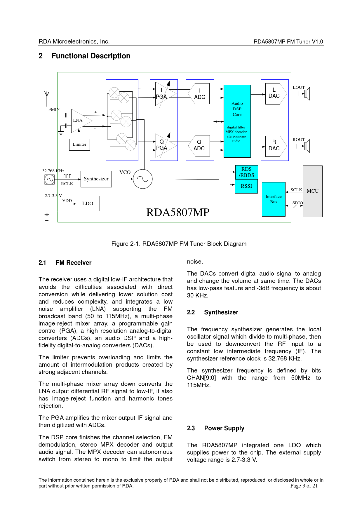 RDA Microelectronics, Inc. RDA5807MP FM Tuner V1.0 2Functional Description LOUT I I L PGA ADC DAC Audio FMIN DSP + Core LNA - digital filter MPX decoder stereo/mono ROUT Q Q audio R Limiter PGA ADC DAC 32.768 KHz RDS VCO /RBDS Synthesizer RCLK RSSI SCLK MCU 2.7-3.3 V Interface VDD Bus SDIO LDO RDA5807MP Figure 2-1. RDA5807MP FM Tuner Block Diagram 2.1FM Receiver noise. The DACs convert digital audio signal to analog The receiver uses a digital low-IF architecture that and change the volume at same time. The DACs avoids the difficulties associated with direct has low-pass feature and -3dB frequency is about conversion while delivering lower solution cost 30 KHz. and reduces complexity, and integrates a low noise amplifier (LNA) supporting the FM 2.2Synthesizer broadcast band (50 to 115MHz), a multi-phase image-reject mixer array, a programmable gain control (PGA), a high resolution analog-to-digital The frequency synthesizer generates the local converters (ADCs), an audio DSP and a high- oscillator signal which divide to multi-phase, then fidelity digital-to-analog converters (DACs). be used to downconvert the RF input to a constant low intermediate frequency (IF). The The limiter prevents overloading and limits the synthesizer reference clock is 32.768 KHz. amount of intermodulation products created by strong adjacent channels. The synthesizer frequency is defined by bits CHAN[9:0] with the range from 50MHz to The multi-phase mixer array down converts the 115MHz. LNA output differential RF signal to low-IF, it also has image-reject function and harmonic tones rejection. The PGA amplifies the mixer output IF signal and then digitized with ADCs. 2.3Power Supply The DSP core finishes the channel selection, FM demodulation, stereo MPX decoder and output The RDA5807MP integrated one LDO which audio signal. The MPX decoder can autonomous supplies power to the chip. The external supply switch from stereo to mono to limit the output voltage range is 2.7-3.3 V. The information contained herein is the exclusive property of RDA and shall not be distributed, reproduced, or disclosed in whole or in part without prior written permission of RDA. Page 3 of 21 Document Outline General Description Features Applications Table of Contents Functional Description FM Receiver Synthesizer Power Supply RESET and Control Interface select Control Interface Electrical Characteristics Receiver Characteristics Serial Interface I2C Interface Timing Register Definition Pins Description Application Diagram Audio Loading Resistance Larger than 32Ω & Reference Clock Application: Bill of Materials: Audio Loading Resistance Larger than 32Ω & DCXO Application: Bill of Materials: Physical Dimension PCB Land Pattern Change List Contact Information
