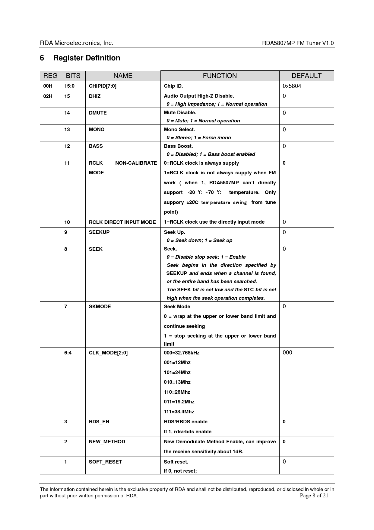 0 = Disabled; 1 = Bass boost enabled 11 RCLK NON-CALIBRATE 0=RCLK clock is always supply 0 MODE 1=RCLK clock is not always supply when FM work ( when 1, RDA5807MP can’t directly support -20