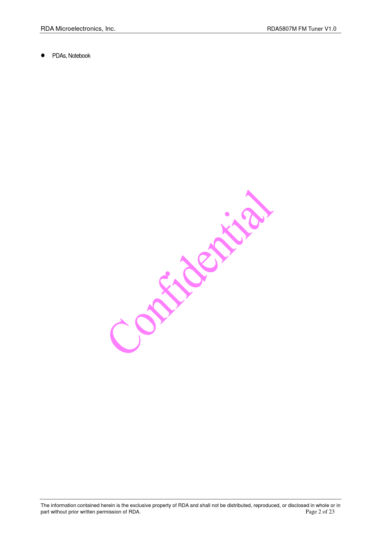 RDA Microelectronics, Inc. RDA5807M FM Tuner V1.0 PDAs, Notebook The information contained herein is the exclusive property of RDA and shall not be distributed, reproduced, or disclosed in whole or in part without prior written permission of RDA. Page 2 of 23