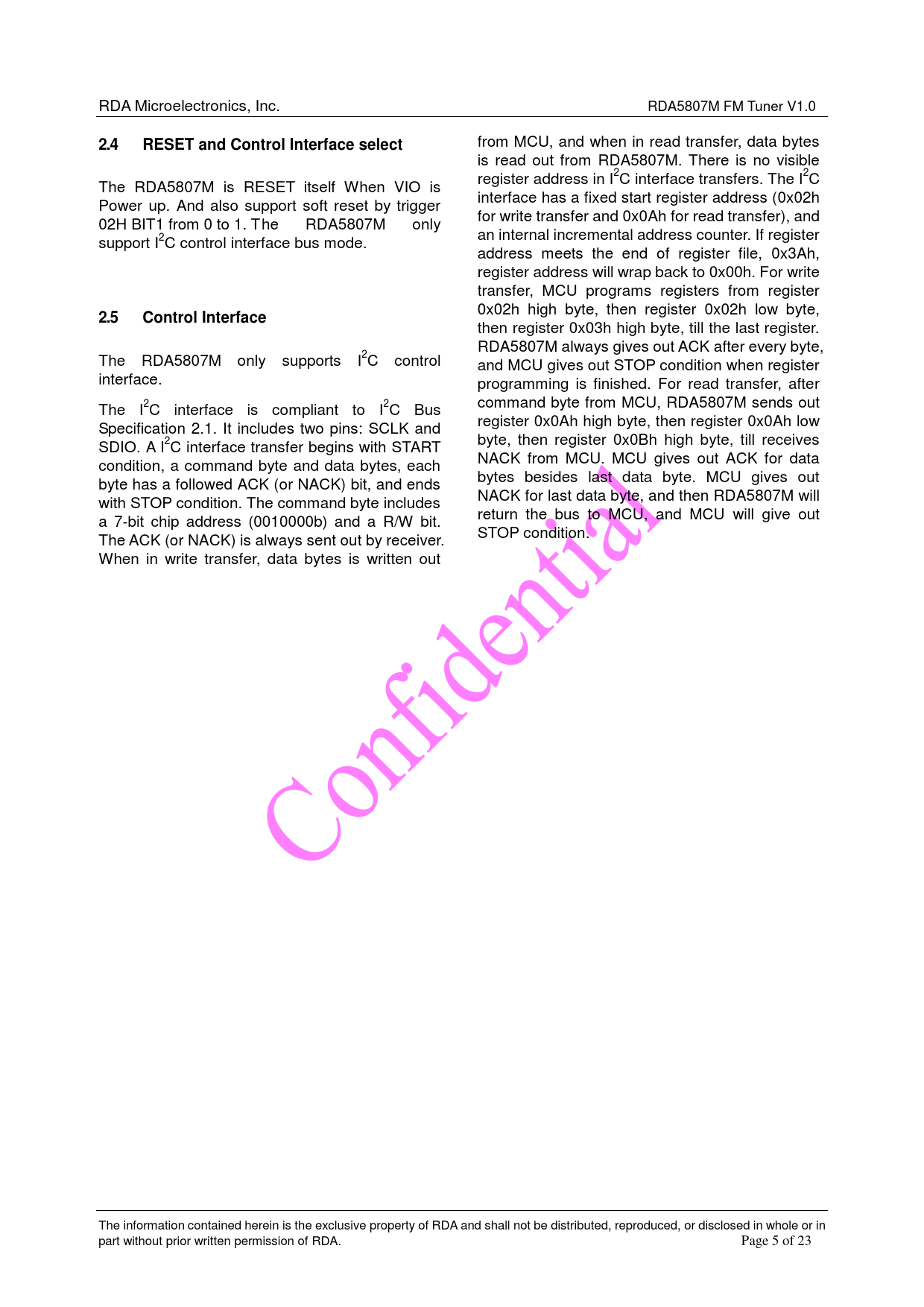 from MCU, and when in read transfer, data bytes is read out from RDA5807M. There is no visible register address in I2C interface transfers. The I2C The RDA5807M is RESET itself When VIO is interface has a fixed start register address (0x02h Power up. And also support soft reset by trigger for write transfer and 0x0Ah for read transfer), and 02H BIT1 from 0 to 1. T he RDA5807M only an internal incremental address counter. If register support I2C control interface bus mode. address meets the end of register file, 0x3Ah, register address will wrap back to 0x00h. For write transfer, MCU programs registers from register 0x02h high byte, then register 0x02h low byte,