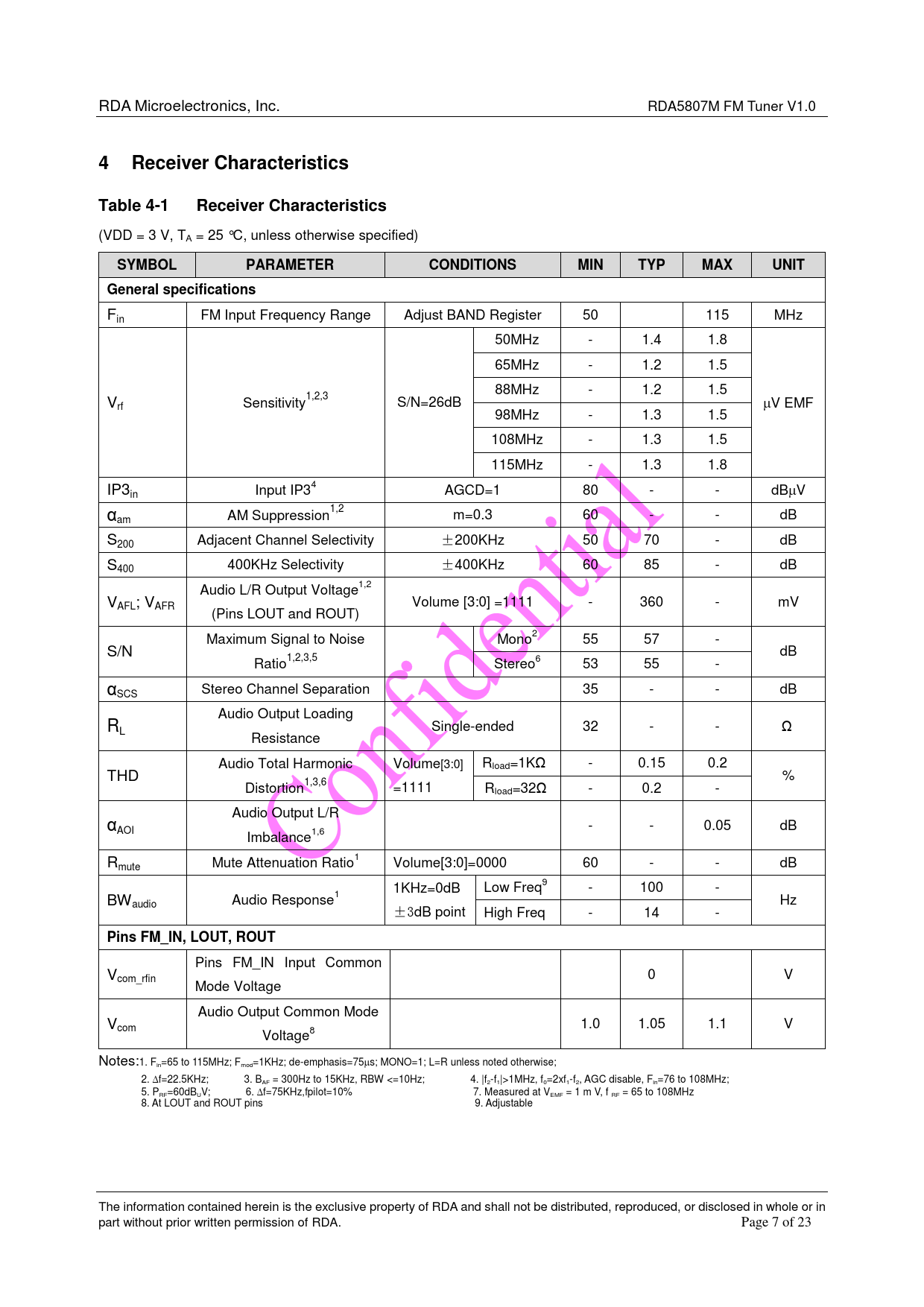 Receiver Characteristics. Table 4-1. SYMBOL. PARAMETER. CONDITIONS. MIN. TYP. MAX. UNIT. General specifications. Pins FM_IN, LOUT, ROUT