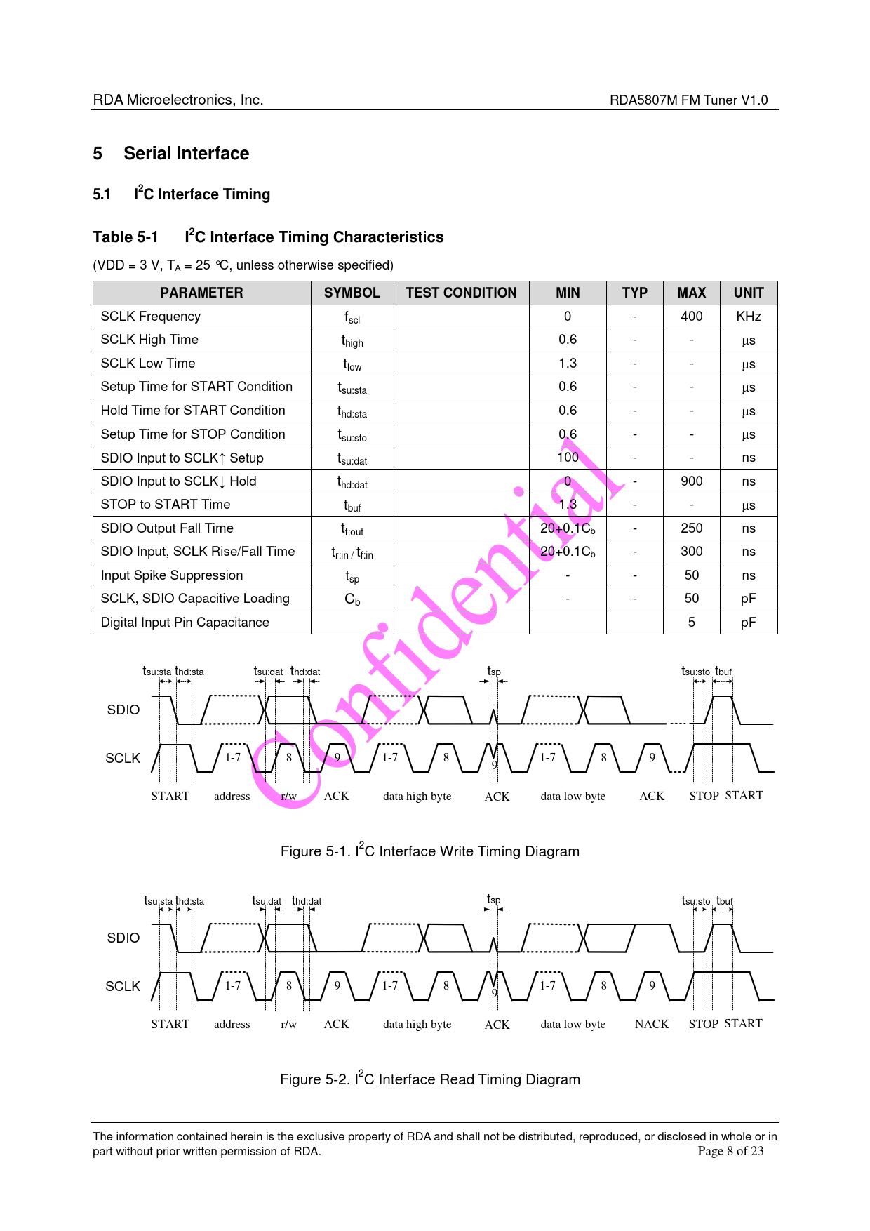 SCLK Frequency fscl 0 - 400 KHz SCLK High Time thigh 0.6 - - s SCLK Low Time tlow 1.3 - - s Setup Time for START Condition tsu:sta 0.6 - - s Hold Time for START Condition thd:sta 0.6 - - s Setup Time for STOP Condition tsu:sto 0.6 - - s SDIO Input to SCLK↑ Setup tsu:dat 100 - - ns SDIO Input to SCLK↓ Hold thd:dat 0 - 900 ns STOP to START Time tbuf 1.3 - - s SDIO Output Fall Time tf:out 20+0.1Cb - 250 ns SDIO Input, SCLK Rise/Fall Time tr:in / tf:in 20+0.1Cb - 300 ns Input Spike Suppression tsp - - 50 ns SCLK, SDIO Capacitive Loading Cb - - 50 pF Digital Input Pin Capacitance 5 pF tsu:sta thd:sta tsu:dat thd:dat tsp tsu:sto tbuf SDIO SCLK 1-7 8 9 1-7 8 1-7 8 9 9 START address r/w ACK data high byte ACK data low byte ACK STOP START Figure 5-1. I2C Interface Write Timing Diagram tsu:sta thd:sta tsu:dat thd:dat tsp tsu:sto tbuf SDIO SCLK 1-7 8 9 1-7 8 1-7 8 9 9 START address r/w ACK data high byte ACK data low byte NACK STOP START Figure 5-2. I2C Interface Read Timing Diagram The information contained herein is the exclusive property of RDA and shall not be distributed, reproduced, or disclosed in whole or in part without prior written permission of RDA. Page 8 of 23