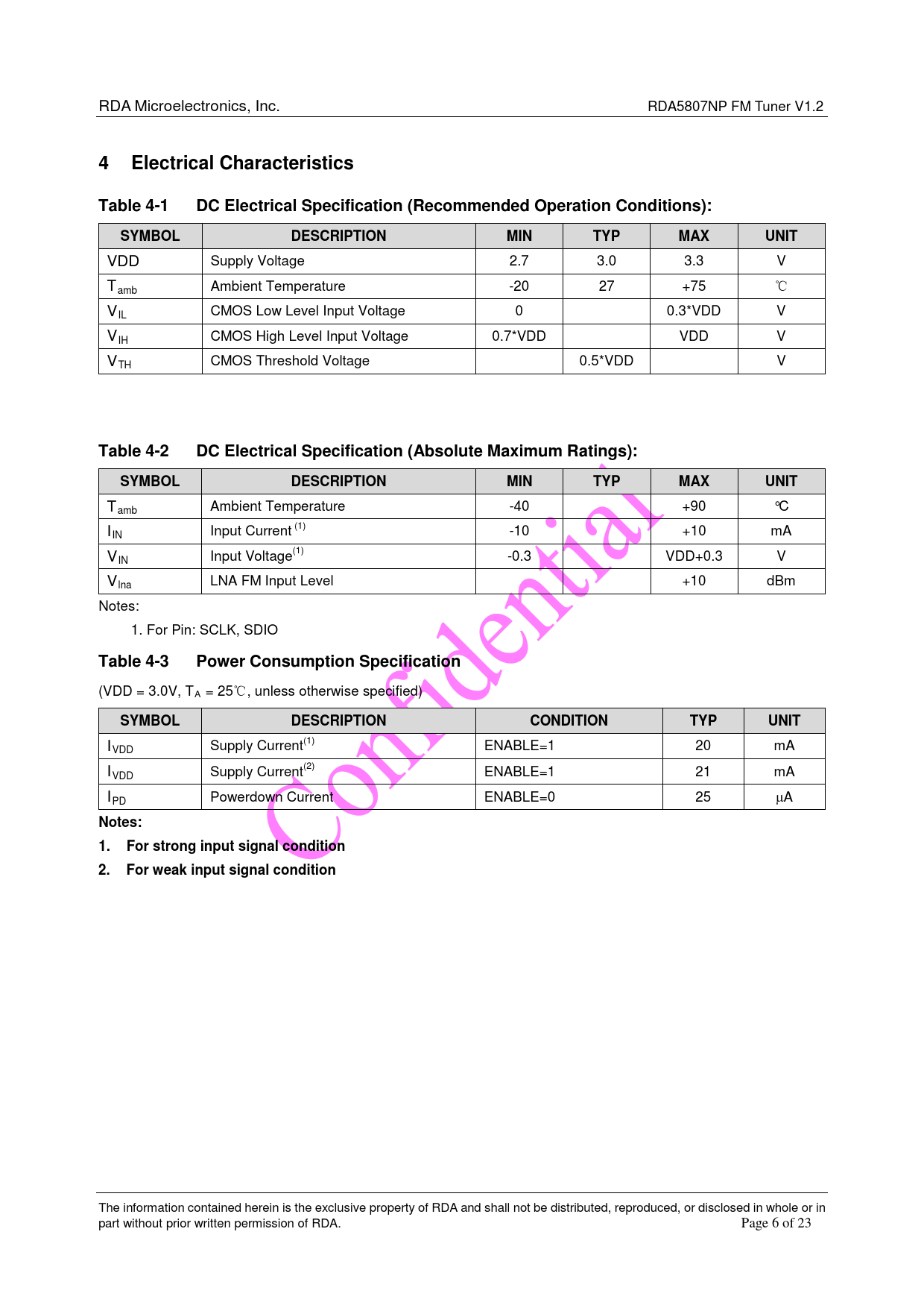 RDA Microelectronics, Inc. RDA5807NP FM Tuner V1.2 4 Electrical CharacteristicsTable 4-1DC Electrical Specification (Recommended Operation Conditions):SYMBOLDESCRIPTIONMINTYPMAXUNIT VDD Supply Voltage 2.7 3.0 3.3 V T Ambient Temperature amb -20 27 +75 ℃ V CMOS Low Level Input Voltage IL 0 0.3*VDD V V CMOS High Level Input Voltage IH 0.7*VDD VDD V V CMOS Threshold Voltage TH 0.5*VDD V Table 4-2DC Electrical Specification (Absolute Maximum Ratings):SYMBOLDESCRIPTIONMINTYPMAXUNIT T Ambient Temperature amb -40 +90 °C I Input Current (1) IN -10 +10 mA V Input Voltage(1) IN -0.3 VDD+0.3 V V LNA FM Input Level lna +10 dBm Notes: 1. For Pin: SCLK, SDIO Table 4-3Power Consumption Specification (VDD = 3.0V, TA = 25℃, unless otherwise specified) SYMBOLDESCRIPTIONCONDITIONTYPUNIT I Supply Current(1) VDD ENABLE=1 20 mA I Supply Current(2) VDD ENABLE=1 21 mA I Powerdown Current PD ENABLE=0 25 µA Notes:1. For strong input signal condition2. For weak input signal condition The information contained herein is the exclusive property of RDA and shall not be distributed, reproduced, or disclosed in whole or in part without prior written permission of RDA. Page 6 of 23 Document Outline 1 General Description Features Applications 2 Table of Contents 3 Functional Description 3.1 FM Receiver Synthesizer Power Supply RESET and Control Interface select Control Interface IP2PS Audio Data Interface GPIO Outputs 4 Electrical Characteristics 5 Receiver Characteristics 6 Serial Interface 6.1 IP2PC Interface Timing 7 Register Definition 8 Pins Description 9 Application Diagram 9.1 RDA5807FP Common Application : Bill of Materials: 10 Physical Dimension 11 PCB Land Pattern: 12 Change List Contact Information
