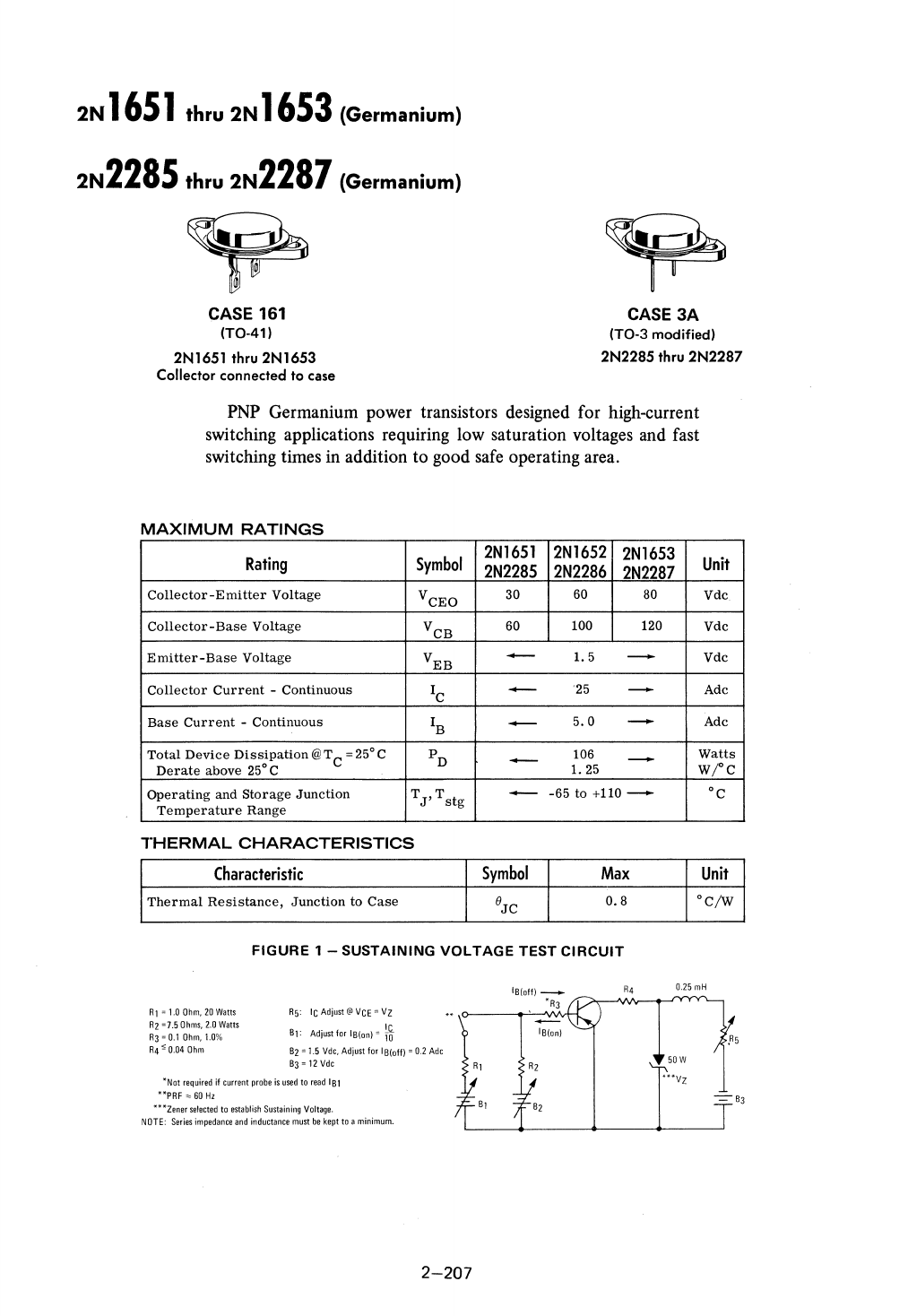 Thermal Resistance, Junction to Case Symbol Max Unit IiJC 0.8 °C/W FIGURE 1 -SUSTAINING VOLTAGE TEST CIRCUIT