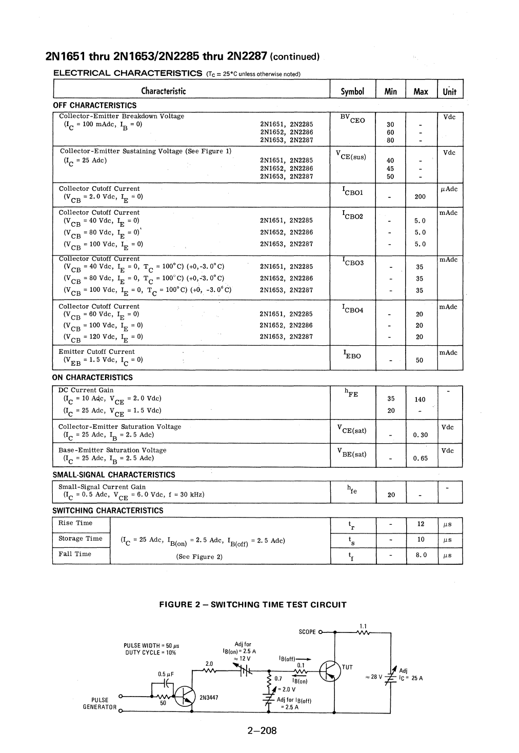 2N1651 thru 2N1653/2N2285 thru 2N2287 (continued). ELECTRICAL CHARACTERISTICS I (Tc =2SC unless otherwise noted)