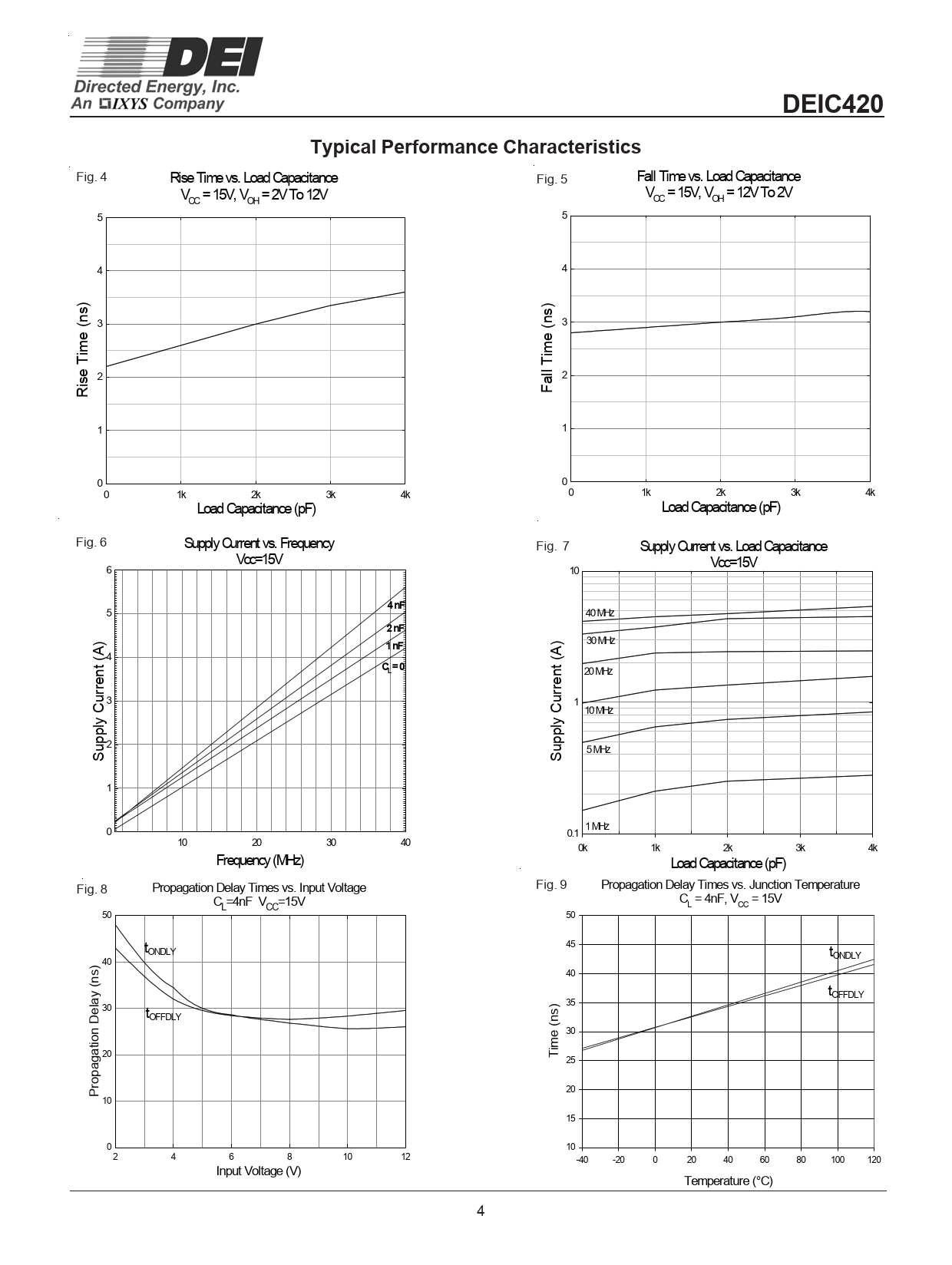 DEIC420Typical Performance Characteristics Fig. 4 Rise Time vs. Load Capacitance Fig. 5 Fal Time vs. Load Capacitance V = 15V, V = 2V To 12V V = 15V, V = 12V To 2V CC OH CC OH 5 5 4 4 s) s) 3 3 (n e e (n im T 2 2 ise Fall Tim R 1 1 0 0 0 1k 2k 3k 4k 0 1k 2k 3k 4k Load Capacitance (pF) Load Capacitance (pF) Fig. 6 Supply Current vs. Frequency Fig. 7 Supply Current vs. Load Capacitance Vcc=15V Vcc=15V 6 10 4 nF 5 40 MHz 2 nF ) 30 MHz A 1 nF A 4 C = 0L 20 MHz urrent ( 3 urrent ( 1 C 10 MHz pply upply C 2 u S S 5 MHz 1 0 1 MHz 0.1 10 20 30 40 0k 1k 2k 3k 4k Frequency (MHz) Load Capacitance (pF) Fig. 8 Propagation Delay Times vs. Input Voltage Fig. 9 Propagation Delay Times vs. Junction Temperature C =4nF V =15V C = 4nF, V = 15V L CC L CC 50 50 t 45 ONDLY tONDLY 40 s) 40 (n tOFFDLY 35 elay 30 t D OFFDLY ns) ( 30 tion me 20 Ti aga 25 rop P 20 10 15 0 10 2 4 6 8 10 12 -40 -20 0 20 40 60 80 100 120 Input Voltage (V) Temperature (°C) 4