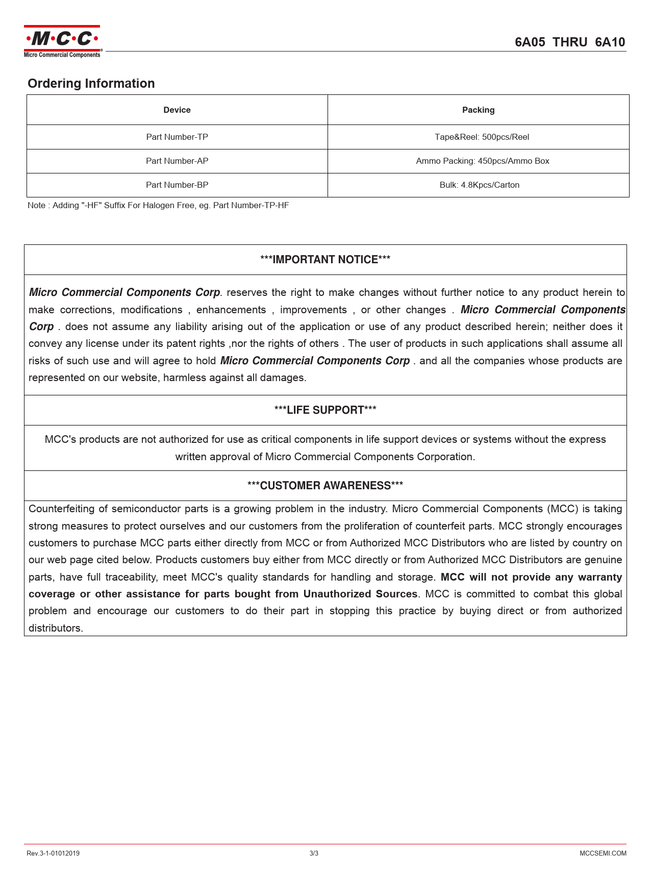 6A05 THRU 6A10. Ordering Information. Device. Packing. ***IMPORTANT NOTICE***. Micro Commercial Components Corp. ***LIFE SUPPORT***