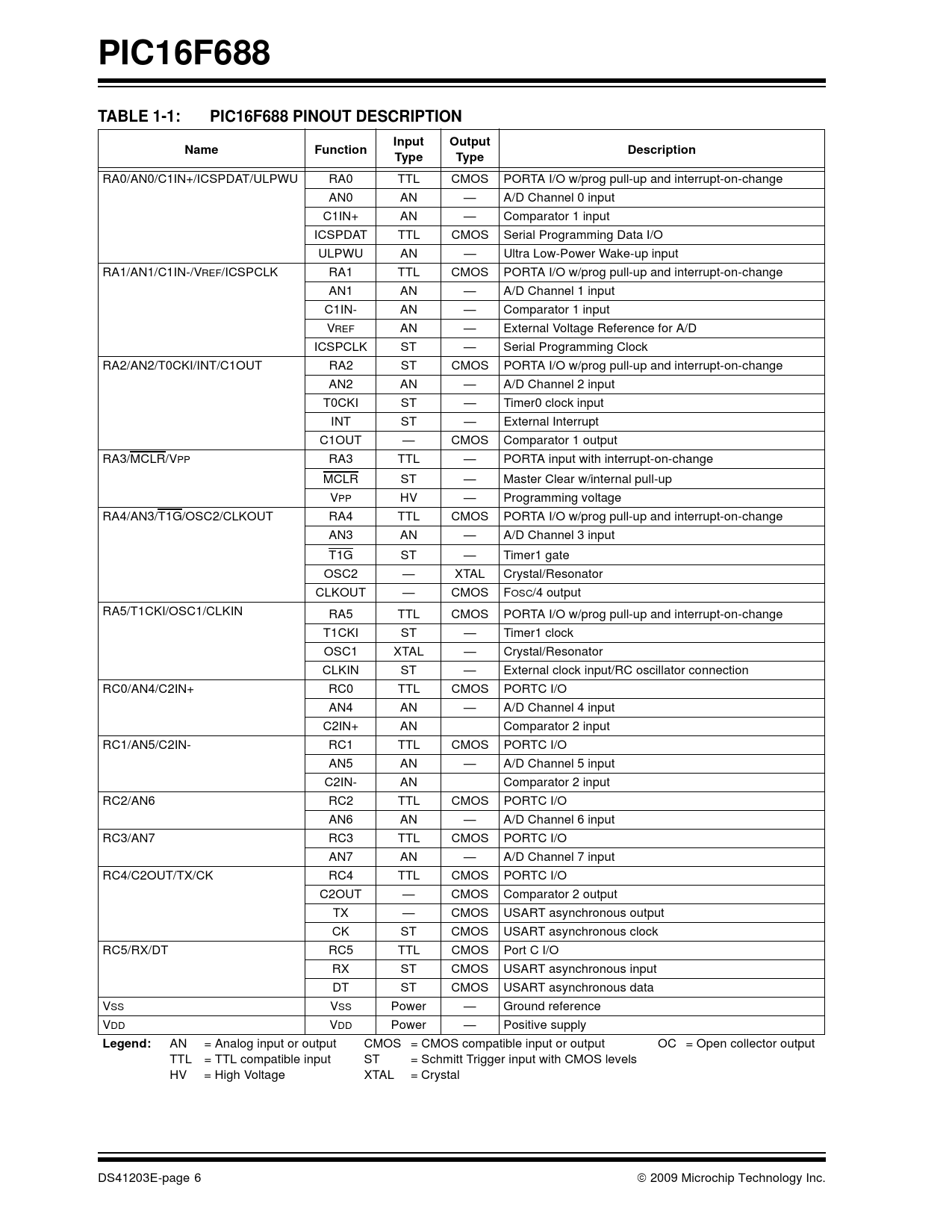 PIC16F688. TABLE 1-1:. PIC16F688 PINOUT DESCRIPTION. Input. Output. Name. Function. Description. Type. Legend: