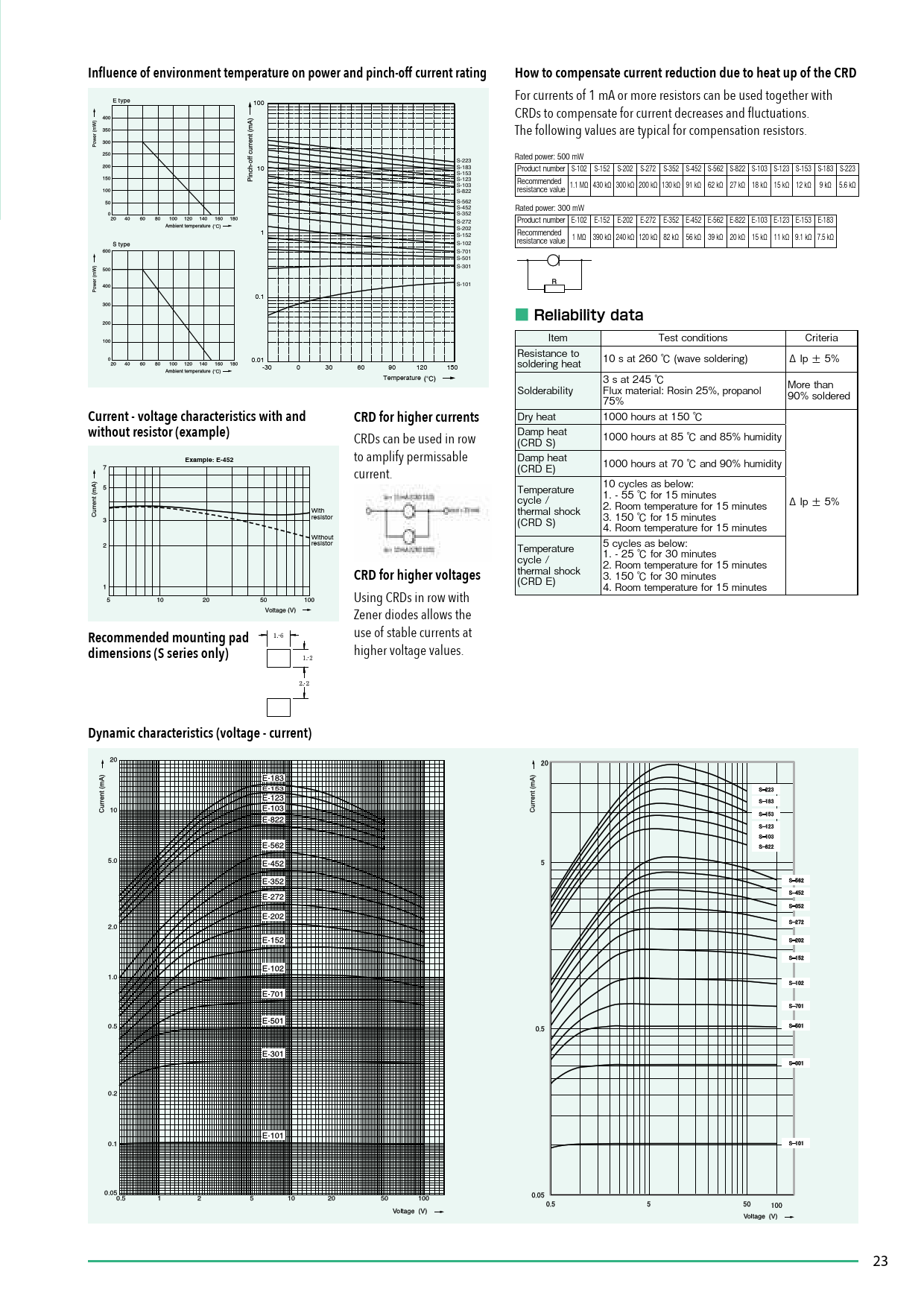 Influence of environment temperature on power and pinch-off current ratingHow to compensate current reduction due to heat up of the CRD For currents of 1 mA or more resistors can be used together with 100 CRDs to compensate for current decreases and fluctuations. The following values are typical for compensation resistors. Rated power: 500 mW S-223 10 S-183 Product number S-102 S-152 S-202 S-272 S-352 S-452 S-562 S-822 S-103 S-123 S-153 S-183 S-223 S-153 S-123 Recommended S-103 S-822 resistance value 1.1 MΩ 430 kΩ 300 kΩ 200 kΩ 130 kΩ 91 kΩ 62 kΩ 27 kΩ 18 kΩ 15 kΩ 12 kΩ 9 kΩ 5.6 kΩ S-562 S-452 Rated power: 300 mW S-352 S-272 Product number E-102 E-152 E-202 E-272 E-352 E-452 E-562 E-822 E-103 E-123 E-153 E-183 1 S-202 Recommended S-152 resistance value 1 MΩ 390 kΩ 240 kΩ 120 kΩ 82 kΩ 56 kΩ 39 kΩ 20 kΩ 15 kΩ 11 kΩ 9.1 kΩ 7.5 kΩ S-102 S-701 S-501 S-301 S-101 0.1 ■ Reliability data Item Test conditions Criteria Resistance to 0.01-30 0 30 60 90 120 150 soldering heat 10 s at 260 ℃ (wave soldering) Δ Ip ± 5% Temperature 3 s at 245 ℃ Solderability Flux material: Rosin 25%, propanol More than 75% 90% soldered Current - voltage characteristics with andCRD for higher currents Dry heat 1000 hours at 150 ℃ without resistor (example) CRDs can be used in row Damp heat (CRD S) 1000 hours at 85 ℃ and 85% humidity Example: E-452 to amplify permissable Damp heat current. (CRD E) 1000 hours at 70 ℃ and 90% humidity Temperature 10 cycles as below: cycle / 1. - 55 ℃ for 15 minutes Δ Ip ± 5% 2. Room temperature for 15 minutes With thermal shock resistor (CRD S) 3. 150 ℃ for 15 minutes 4. Room temperature for 15 minutes Without resistor Temperature 5 cycles as below: cycle / 1. - 25 ℃ for 30 minutes 2. Room temperature for 15 minutes CRD for higher voltages thermal shock (CRD E) 3. 150 ℃ for 30 minutes 4. Room temperature for 15 minutes Using CRDs in row with Zener diodes allows the Recommended mounting pad use of stable currents at dimensions (S series only) higher voltage values. Dynamic characteristics (voltage - current) 23