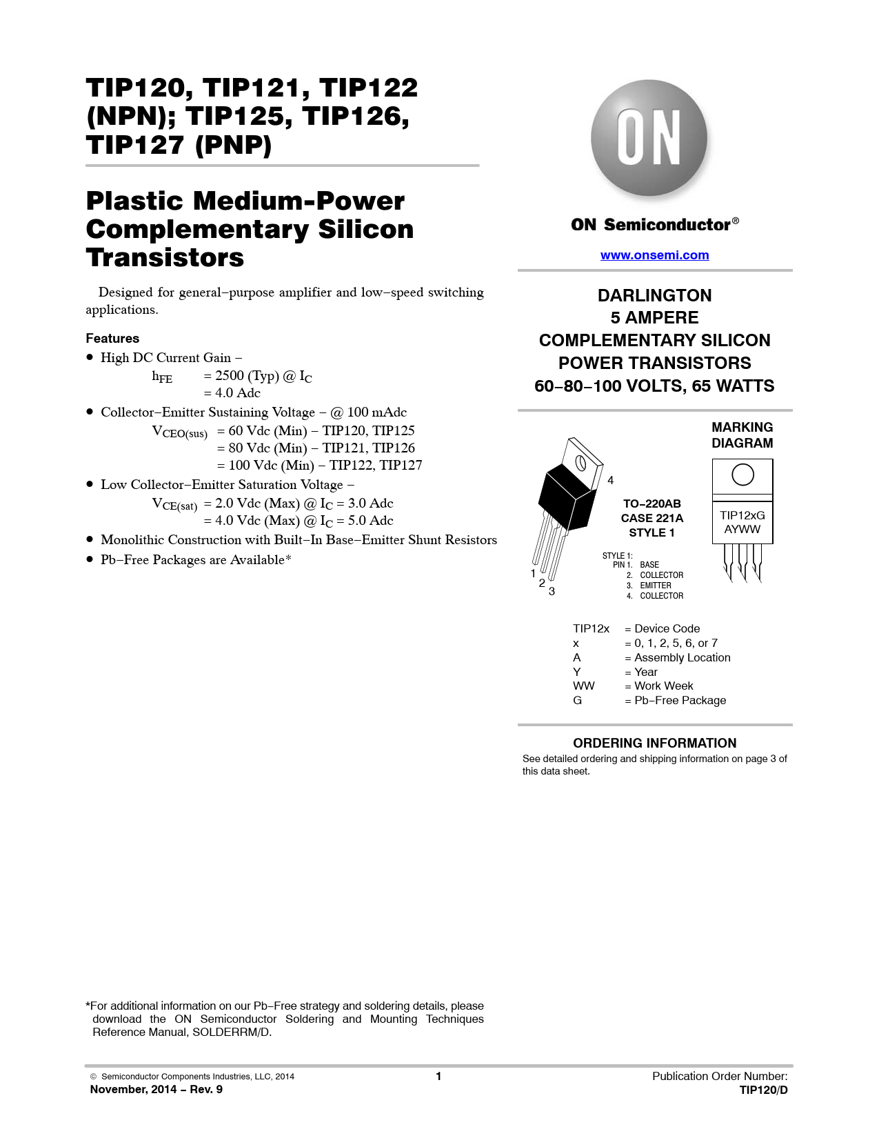 November, 2014 − Rev. 9 TIP120/D
