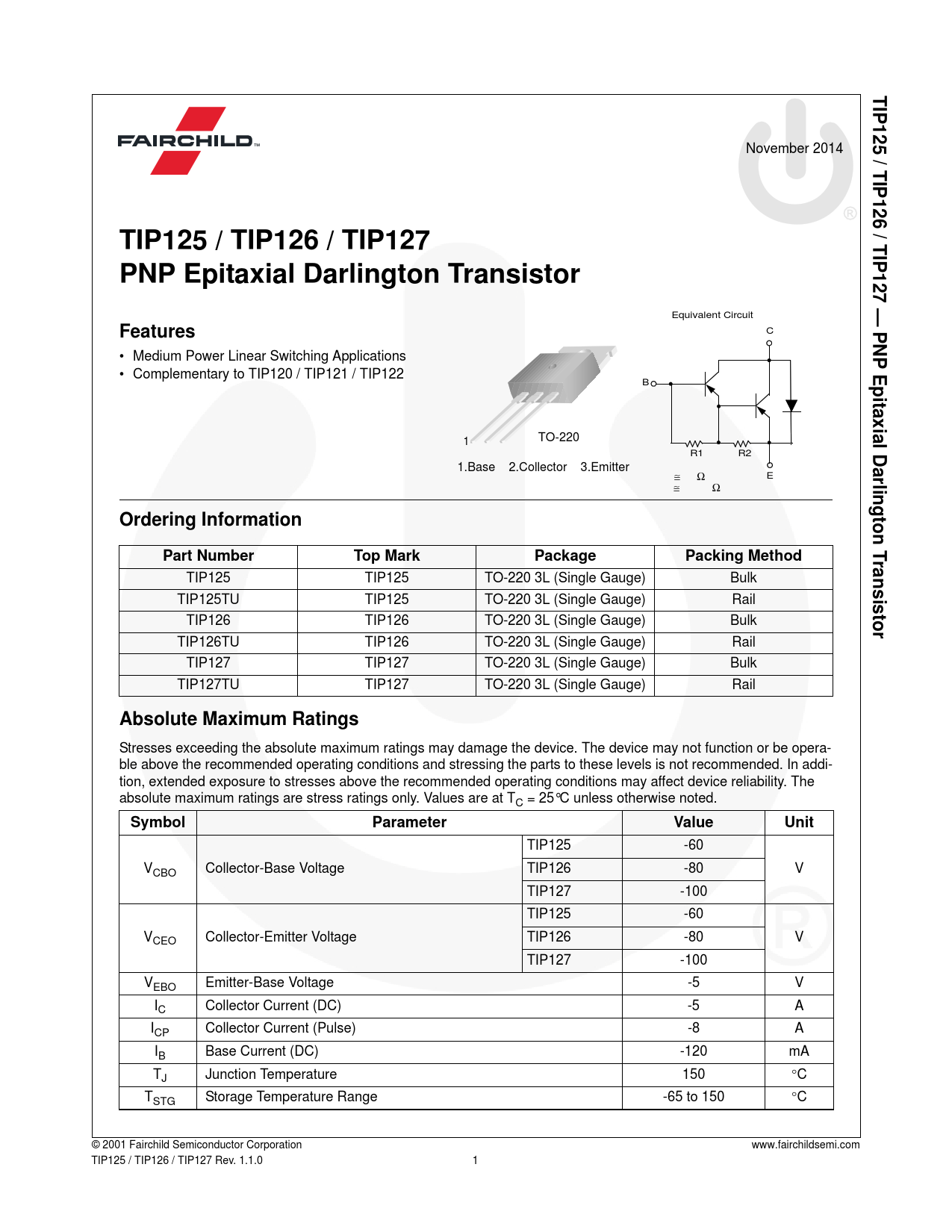 1 TIP125 / TIP126 / TIP127 — PNP Epitaxial Darlington Transistor November 2014
