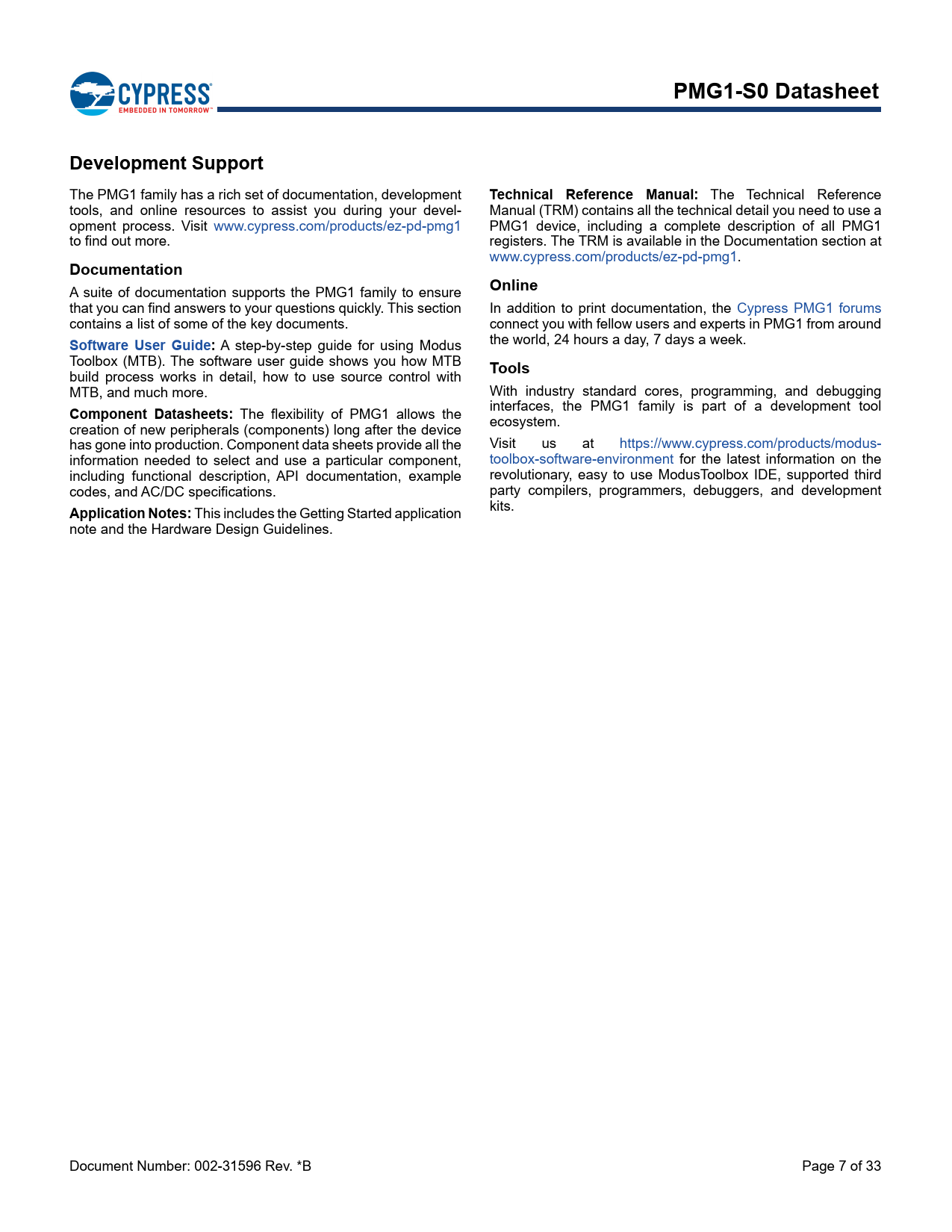 PMG1-S0 DatasheetDevelopment Support The PMG1 family has a rich set of documentation, development Technical Reference Manual: The Technical Reference tools, and online resources to assist you during your devel- Manual (TRM) contains all the technical detail you need to use a opment process. Visit www.cypress.com/products/ez-pd-pmg1 PMG1 device, including a complete description of all PMG1 to find out more. registers. The TRM is available in the Documentation section at www.cypress.com/products/ez-pd-pmg1. Documentation A suite of documentation supports the PMG1 family to ensure Online that you can find answers to your questions quickly. This section In addition to print documentation, the Cypress PMG1 forums contains a list of some of the key documents. connect you with fellow users and experts in PMG1 from around Software User Guide: A step-by-step guide for using Modus the world, 24 hours a day, 7 days a week. Toolbox (MTB). The software user guide shows you how MTB Tools build process works in detail, how to use source control with MTB, and much more. With industry standard cores, programming, and debugging Component Datasheets: The flexibility of PMG1 allows the interfaces, the PMG1 family is part of a development tool ecosystem. creation of new peripherals (components) long after the device has gone into production. Component data sheets provide all the Visit us at https://www.cypress.com/products/modus- information needed to select and use a particular component, toolbox-software-environment for the latest information on the including functional description, API documentation, example revolutionary, easy to use ModusToolbox IDE, supported third codes, and AC/DC specifications. party compilers, programmers, debuggers, and development kits. Application Notes: This includes the Getting Started application note and the Hardware Design Guidelines. Document Number: 002-31596 Rev. *B Page 7 of 33 Document Outline PMG1-S0 Datasheet, Power Delivery Microcontroller Gen1 PMG1 Family General Description PMG1-S0 General Description Features Type-C Support and USB-PD Support Legacy/Proprietary Charging Block System-Level Fault Protection 32-bit MCU Subsystem Clocks and Oscillators Power System-Level ESD Protection Packages Block Diagram Contents Development Support Documentation Online Tools ModusToolbox™ IDE and PMG1 SDK Functional Overview MCU Subsystem CPU Flash SROM USB-PD Subsystem (SS) USB-PD Physical Layer ADC Charger Detection VBUS Undervoltage and Overvoltage Protection VBUS Short Protection PFET Gate Drivers on VBUS Path VBUS Discharge FETs Integrated Digital Blocks Serial Communication Blocks (SCB) Timer/Counter/PWM Block (TCPWM) I/O Subsystem Power Systems Overview Pinouts Application Diagram Electrical Specifications Absolute Maximum Ratings Device-Level Specifications I/O Digital Peripherals Pulse Width Modulation (PWM) for GPIO Pins I2C System Resources Power-on-Reset (POR) with Brown Out SWD Interface Internal Main Oscillator Internal Low-Speed Oscillator Power Down Gate Driver Specifications Analog to Digital Converter Memory Ordering Information Ordering Code Definitions Packaging Acronyms Document Conventions Units of Measure Document History Page Sales, Solutions, and Legal Information Worldwide Sales and Design Support Products PSoC® Solutions Cypress Developer Community Technical Support