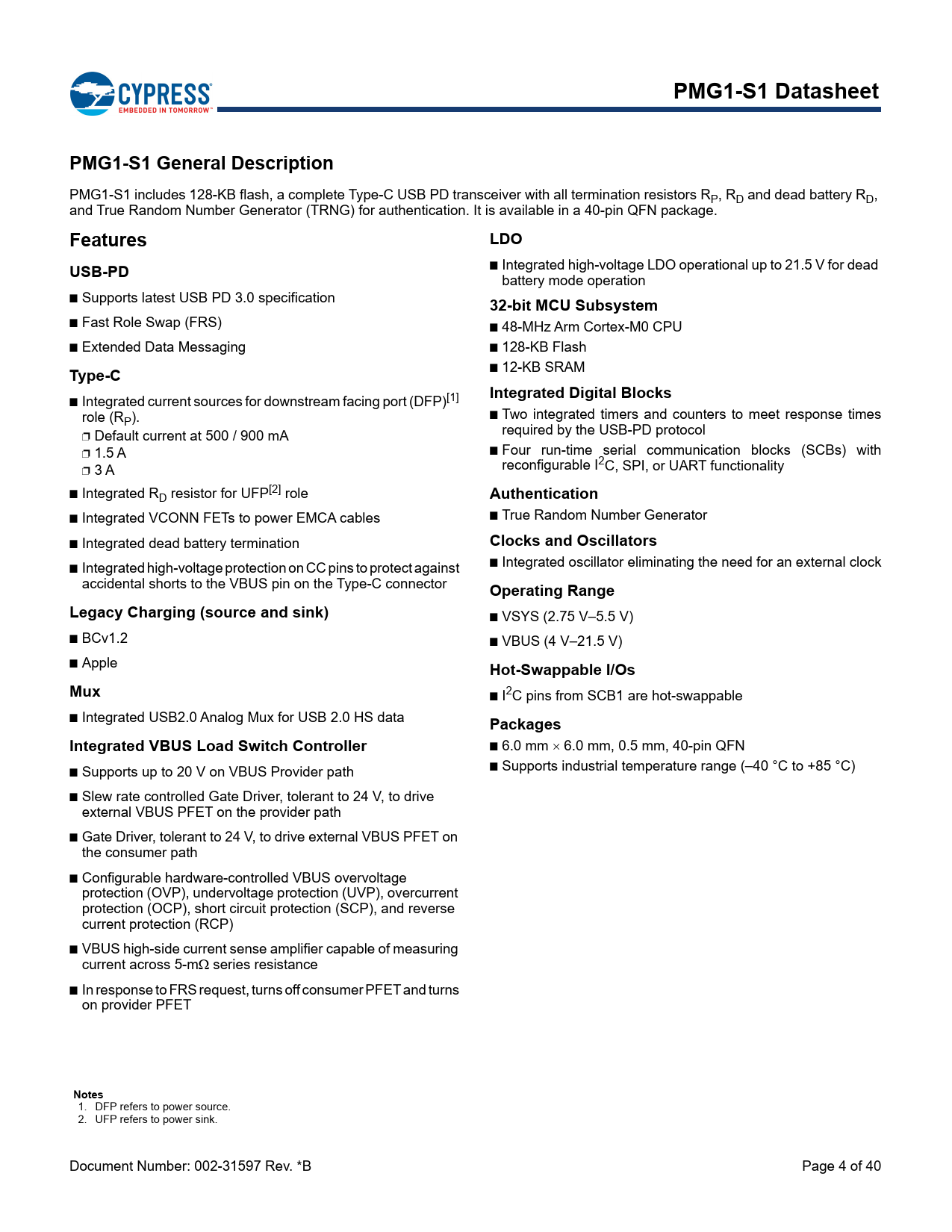 link to page 5 link to page 5 PMG1-S1 DatasheetPMG1-S1 General Description PMG1-S1 includes 128-KB flash, a complete Type-C USB PD transceiver with all termination resistors RP, RD and dead battery RD, and True Random Number Generator (TRNG) for authentication. It is available in a 40-pin QFN package. FeaturesLDOUSB-PD ■ Integrated high-voltage LDO operational up to 21.5 V for dead battery mode operation ■ Supports latest USB PD 3.0 specification 32-bit MCU Subsystem ■ Fast Role Swap (FRS) ■ 48-MHz Arm Cortex-M0 CPU ■ Extended Data Messaging ■ 128-KB Flash Type-C ■ 12-KB SRAM Integrated Digital Blocks ■ Integrated current sources for downstream facing port (DFP)[1] role (RP). ■ Two integrated timers and counters to meet response times required by the USB-PD protocol ❐ Default current at 500 / 900 mA ❐ 1.5 A ■ Four run-time serial communication blocks (SCBs) with ❐ 3 A reconfigurable I2C, SPI, or UART functionality ■ Integrated RD resistor for UFP[2] role Authentication ■ Integrated VCONN FETs to power EMCA cables ■ True Random Number Generator ■ Integrated dead battery termination Clocks and Oscillators ■ Integrated high-voltage protection on CC pins to protect against ■ Integrated oscillator eliminating the need for an external clock accidental shorts to the VBUS pin on the Type-C connector Operating RangeLegacy Charging (source and sink) ■ VSYS (2.75 V–5.5 V) ■ BCv1.2 ■ VBUS (4 V–21.5 V) ■ Apple Hot-Swappable I/OsMux ■ I2C pins from SCB1 are hot-swappable ■ Integrated USB2.0 Analog Mux for USB 2.0 HS data PackagesIntegrated VBUS Load Switch Controller ■ 6.0 mm 6.0 mm, 0.5 mm, 40-pin QFN ■ Supports up to 20 V on VBUS Provider path ■ Supports industrial temperature range (–40 °C to +85 °C) ■ Slew rate controlled Gate Driver, tolerant to 24 V, to drive external VBUS PFET on the provider path ■ Gate Driver, tolerant to 24 V, to drive external VBUS PFET on the consumer path ■ Configurable hardware-controlled VBUS overvoltage protection (OVP), undervoltage protection (UVP), overcurrent protection (OCP), short circuit protection (SCP), and reverse current protection (RCP) ■ VBUS high-side current sense amplifier capable of measuring current across 5-m series resistance ■ In response to FRS request, turns off consumer PFET and turns on provider PFET Notes 1. DFP refers to power source. 2. UFP refers to power sink. Document Number: 002-31597 Rev. *B Page 4 of 40 Document Outline PMG1-S1 Datasheet, Power Delivery Microcontroller Gen1 PMG1 Family General Description PMG1-S1 General Description Features USB-PD Type-C Legacy Charging (source and sink) Mux Integrated VBUS Load Switch Controller LDO 32-bit MCU Subsystem Integrated Digital Blocks Authentication Clocks and Oscillators Operating Range Hot-Swappable I/Os Packages Block Diagram Contents Development Support Documentation Online Tools ModusToolbox™ IDE and PMG1 SDK Functional Overview USB-PD Subsystem (SS) USB-PD Physical Layer VCONN FET ADC USB 2.0 Mux VBUS Discharge VBUS Regulator Gate Driver for VBUS PFET on Consumer Path Charger Detect High-Voltage Tolerant CC Lines VBUS Load Switch Controller for Provider Path RCP CSA Slew-Rate Controllable Gate Driver Overvoltage and Undervoltage Protection on VBUS Overcurrent Protection on VBUS True Random Number Generator CPU and Memory Subsystem CPU Flash SROM SRAM Peripherals Timer/Counter/PWM Block (TCPWM) GPIO Power System Overview Pinouts Application Diagrams Electrical Specifications Absolute Maximum Ratings Device-Level Specifications DC Specifications CPU GPIO XRES Digital Peripherals Pulse Width Modulation (PWM) for GPIO Pins I2C UART SPI Memory System Resources Power-on-Reset (POR) with Brown Out SWD Interface Internal Main Oscillator Internal Low-speed Oscillator PD Analog-to-Digital Converter Charger Detect VSYS Switch CSA VBUS UV/OV Consumer Side PFET Gate Driver Provider Side PFET Gate Driver Provider Side PFET RCP DP/DM Switch VCONN Switch VBUS Ordering Information Ordering Code Definitions Packaging Acronyms Document Conventions Units of Measure Document History Page Sales, Solutions, and Legal Information Worldwide Sales and Design Support Products PSoC® Solutions Cypress Developer Community Technical Support