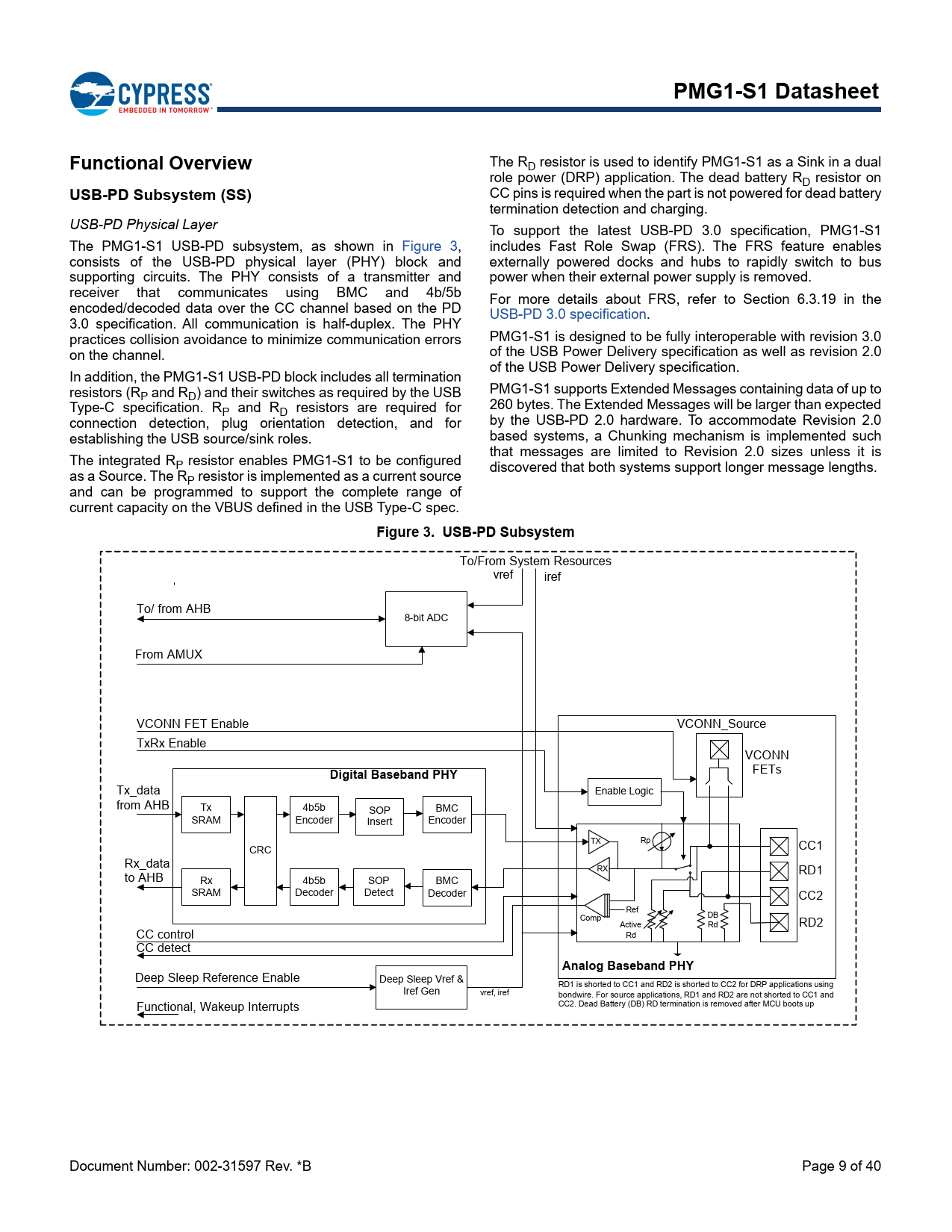 PMG1-S1 Datasheet Functional Overview The RD resistor is used to identify PMG1-S1 as a Sink in a dual role power (DRP) application. The dead battery RD resistor on CC pins is required when the part is not powered for dead battery termination detection and charging. USB-PD Subsystem (SS) USB-PD Physical Layer The PMG1-S1 USB-PD subsystem, as shown in Figure 3, consists of the USB-PD physical layer (PHY) block and supporting circuits. The PHY consists of a transmitter and receiver that communicates using BMC and 4b/5b encoded/decoded data over the CC channel based on the PD 3.0 specification. All communication is half-duplex. The PHY practices collision avoidance to minimize communication errors on the channel. In addition, the PMG1-S1 USB-PD block includes all termination resistors (RP and RD) and their switches as required by the USB Type-C specification. RP and RD resistors are required for connection detection, plug orientation detection, and for establishing the USB source/sink roles. The integrated RP resistor enables PMG1-S1 to be configured as a Source. The RP resistor is implemented as a current source and can be programmed to support the complete range of current capacity on the VBUS defined in the USB Type-C spec. To support the latest USB-PD 3.0 specification, PMG1-S1 includes Fast Role Swap (FRS). The FRS feature enables externally powered docks and hubs to rapidly switch to bus power when their external power supply is removed. For more details about FRS, refer to Section 6.3.19 in the USB-PD 3.0 specification. PMG1-S1 is designed to be fully interoperable with revision 3.0 of the USB Power Delivery specification as well as revision 2.0 of the USB Power Delivery specification. PMG1-S1 supports Extended Messages containing data of up to 260 bytes. The Extended Messages will be larger than expected by the USB-PD 2.0 hardware. To accommodate Revision 2.0 based systems, a Chunking mechanism is implemented such that messages are limited to Revision 2.0 sizes unless it is discovered that both systems support longer message lengths. Figure 3. USB-PD Subsystem To/From System Resources vref iref To/ from AHB 8-bit ADC From AMUX VCONN FET Enable VCONN_Source TxRx Enable VCONN FETs Digital Baseband PHY Tx_data from AHB Enable Logic Tx SRAM 4b5b Encoder SOP Insert BMC Encoder Rx_data to AHB Rp TX CRC CC1 RX Rx SRAM 4b5b Decoder SOP Detect CC2 Comp CC control CC detect Deep Sleep Reference Enable Functional, Wakeup Interrupts Document Number: 002-31597 Rev. *B RD1 BMC Decoder Ref Active Rd DB Rd RD2 Analog Baseband PHY Deep Sleep Vref & Iref Gen vref, iref RD1 is shorted to CC1 and RD2 is shorted to CC2 for DRP applications using bondwire. For source applications, RD1 and RD2 are not shorted to CC1 and CC2. Dead Battery (DB) RD termination is removed after MCU boots up Page 9 of 40