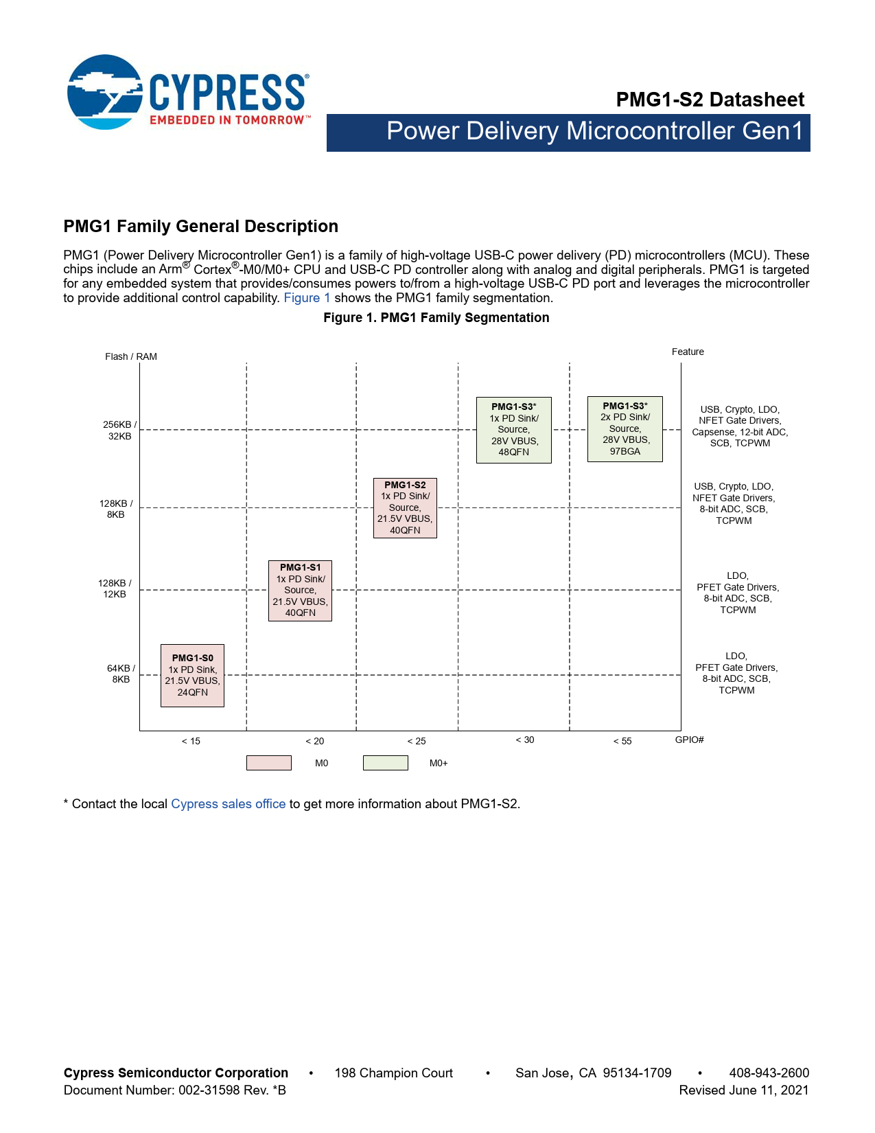 link to page 2 PMG1-S2 Datasheet Power Delivery Microcontroller Gen1 PMG1-S2 Datasheet Power Delivery Microcontroller Gen1PMG1 Family General Description PMG1 (Power Delivery Microcontroller Gen1) is a family of high-voltage USB-C power delivery (PD) microcontrollers (MCU). These chips include an Arm® Cortex®-M0/M0+ CPU and USB-C PD controller along with analog and digital peripherals. PMG1 is targeted for any embedded system that provides/consumes powers to/from a high-voltage USB-C PD port and leverages the microcontroller to provide additional control capability. Figure 1 shows the PMG1 family segmentation. Figure 1. PMG1 Family Segmentation Flash / RAM Feature PMG1-S3*PMG1-S3* USB, Crypto, LDO, 1x PD Sink/ 2x PD Sink/ 256KB / NFET Gate Drivers, Source, Source, 32KB Capsense, 12-bit ADC, 28V VBUS, 28V VBUS, SCB, TCPWM 48QFN 97BGA PMG1-S2 USB, Crypto, LDO, 1x PD Sink/ NFET Gate Drivers, 128KB / Source, 8-bit ADC, SCB, 8KB 21.5V VBUS, TCPWM 40QFN PMG1-S1 1x PD Sink/ LDO, 128KB / Source, PFET Gate Drivers, 12KB 21.5V VBUS, 8-bit ADC, SCB, 40QFN TCPWM PMG1-S0 LDO, 64KB / 1x PD Sink, PFET Gate Drivers, 8KB 21.5V VBUS, 8-bit ADC, SCB, 24QFN TCPWM < 15 < 20 < 25 < 30 < 55 GPIO# M0 M0+ * Contact the local Cypress sales office to get more information about PMG1-S2. Cypress Semiconductor Corporation • 198 Champion Court • San Jose, CA 95134-1709 • 408-943-2600 Document Number: 002-31598 Rev. *B Revised June 11, 2021 Document Outline PMG1-S2 Datasheet Power Delivery Microcontroller Gen1 PMG1 Family General Description PMG1-S2 General Description Features Type-C and USB-PD Support 32-bit MCU Subsystem Integrated Digital Blocks Clocks and Oscillators Power System-Level ESD Protection Packages Block Diagram Contents Development Support Documentation Online Tools ModusToolbox™ IDE and the PMG1 SDK Functional Overview CPU and Memory Subsystem Crypto Block Integrated Billboard Device USB-PD Subsystem (USBPD SS) Full-Speed USB Subsystem Peripherals GPIO Power Systems Overview Pinouts Application Diagrams Electrical Specifications Absolute Maximum Ratings Device-Level Specifications Digital Peripherals System Resources Ordering Information Ordering Code Definitions Packaging Acronyms Document Conventions Units of Measure Document History Page Sales, Solutions, and Legal Information Worldwide Sales and Design Support Products PSoC® Solutions Cypress Developer Community Technical Support
