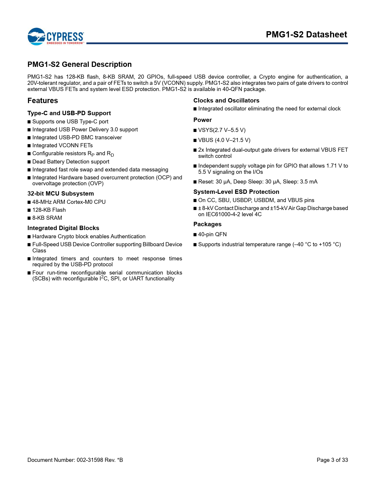 PMG1-S2 Datasheet PMG1-S2 General Description Features Clocks and Oscillators Type-C and USB-PD Support Power