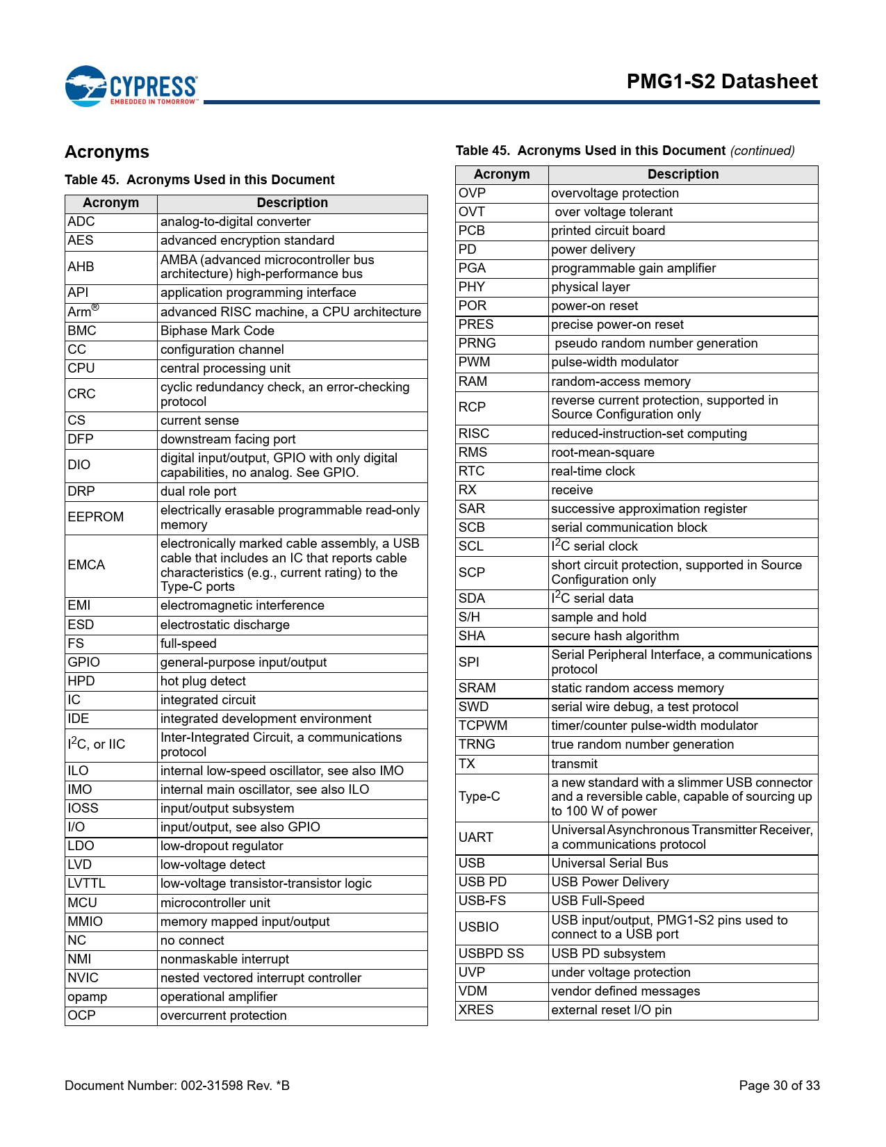 PMG1-S2 DatasheetAcronymsTable 45. Acronyms Used in this Document (continued) Table 45. Acronyms Used in this DocumentAcronymDescription OVP overvoltage protection AcronymDescription OVT over voltage tolerant ADC analog-to-digital converter PCB printed circuit board AES advanced encryption standard PD power delivery AHB AMBA (advanced microcontroller bus architecture) high-performance bus PGA programmable gain amplifier API application programming interface PHY physical layer Arm® advanced RISC machine, a CPU architecture POR power-on reset BMC Biphase Mark Code PRES precise power-on reset CC configuration channel PRNG pseudo random number generation CPU central processing unit PWM pulse-width modulator RAM random-access memory CRC cyclic redundancy check, an error-checking protocol RCP reverse current protection, supported in CS current sense Source Configuration only DFP downstream facing port RISC reduced-instruction-set computing digital input/output, GPIO with only digital RMS root-mean-square DIO capabilities, no analog. See GPIO. RTC real-time clock DRP dual role port RX receive electrically erasable programmable read-only SAR successive approximation register EEPROM memory SCB serial communication block electronically marked cable assembly, a USB SCL I2C serial clock cable that includes an IC that reports cable EMCA characteristics (e.g., current rating) to the SCP short circuit protection, supported in Source Configuration only Type-C ports EMI electromagnetic interference SDA I2C serial data ESD electrostatic discharge S/H sample and hold SHA secure hash algorithm FS full-speed GPIO general-purpose input/output SPI Serial Peripheral Interface, a communications protocol HPD hot plug detect SRAM static random access memory IC integrated circuit SWD serial wire debug, a test protocol IDE integrated development environment TCPWM timer/counter pulse-width modulator I2C, or IIC Inter-Integrated Circuit, a communications TRNG true random number generation protocol ILO internal low-speed oscillator, see also IMO TX transmit IMO internal main oscillator, see also ILO a new standard with a slimmer USB connector Type-C and a reversible cable, capable of sourcing up IOSS input/output subsystem to 100 W of power I/O input/output, see also GPIO UART Universal Asynchronous Transmitter Receiver, LDO low-dropout regulator a communications protocol LVD low-voltage detect USB Universal Serial Bus LVTTL low-voltage transistor-transistor logic USB PD USB Power Delivery MCU microcontroller unit USB-FS USB Full-Speed MMIO memory mapped input/output USBIO USB input/output, PMG1-S2 pins used to NC no connect connect to a USB port NMI nonmaskable interrupt USBPD SS USB PD subsystem NVIC nested vectored interrupt controller UVP under voltage protection opamp operational amplifier VDM vendor defined messages OCP overcurrent protection XRES external reset I/O pin Document Number: 002-31598 Rev. *B Page 30 of 33 Document Outline PMG1-S2 Datasheet Power Delivery Microcontroller Gen1 PMG1 Family General Description PMG1-S2 General Description Features Type-C and USB-PD Support 32-bit MCU Subsystem Integrated Digital Blocks Clocks and Oscillators Power System-Level ESD Protection Packages Block Diagram Contents Development Support Documentation Online Tools ModusToolbox™ IDE and the PMG1 SDK Functional Overview CPU and Memory Subsystem Crypto Block Integrated Billboard Device USB-PD Subsystem (USBPD SS) Full-Speed USB Subsystem Peripherals GPIO Power Systems Overview Pinouts Application Diagrams Electrical Specifications Absolute Maximum Ratings Device-Level Specifications Digital Peripherals System Resources Ordering Information Ordering Code Definitions Packaging Acronyms Document Conventions Units of Measure Document History Page Sales, Solutions, and Legal Information Worldwide Sales and Design Support Products PSoC® Solutions Cypress Developer Community Technical Support