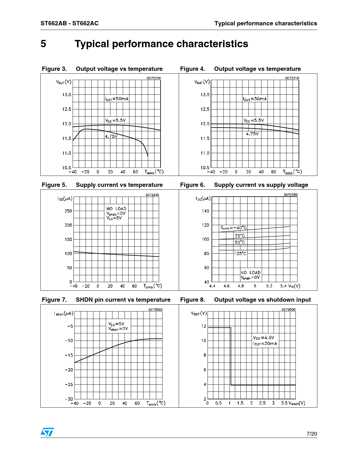 ST662AB - ST662AC Typical performance characteristics 5 Typical performance characteristics Figure 3. Output voltage vs temperature Figure 4. Output voltage vs temperature Figure 5. Supply current vs temperature Figure 6. Supply current vs supply voltage Figure 7. SHDN pin current vs temperature Figure 8. Output voltage vs shutdown input