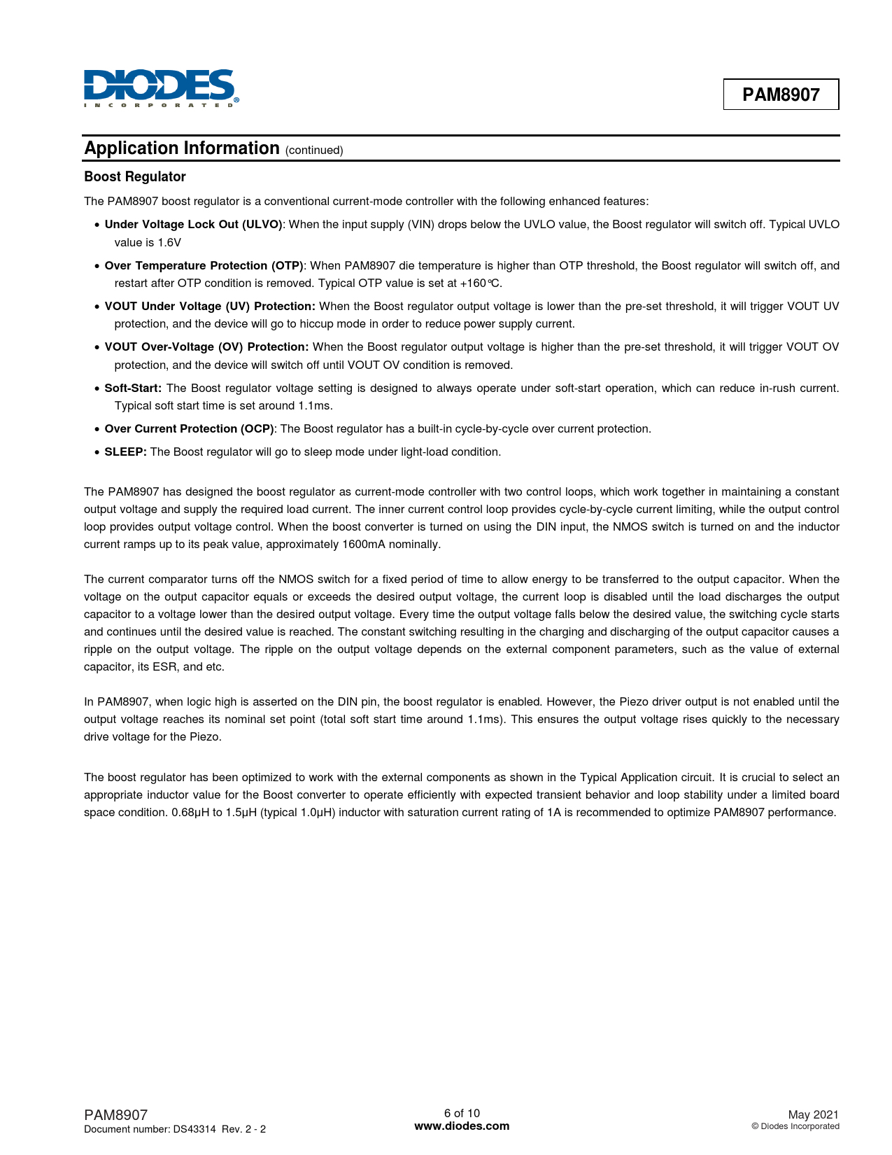 The current comparator turns off the NMOS switch for a fixed period of time to allow energy to be transferred to the output capacitor. When the voltage on the output capacitor equals or exceeds the desired output voltage, the current loop is disabled until the load discharges the output capacitor to a voltage lower than the desired output voltage. Every time the output voltage falls below the desired value, the switching cycle starts and continues until the desired value is reached. The constant switching resulting in the charging and discharging of the output capacitor causes a ripple on the output voltage. The ripple on the output voltage depends on the external component parameters, such as the value of external capacitor, its ESR, and etc. In PAM8907, when logic high is asserted on the DIN pin, the boost regulator is enabled. However, the Piezo driver output is not enabled until the output voltage reaches its nominal set point (total soft start time around 1.1ms). This ensures the output voltage rises quickly to the necessary drive voltage for the Piezo. The boost regulator has been optimized to work with the external components as shown in the Typical Application circuit. It is crucial to select an appropriate inductor value for the Boost converter to operate efficiently with expected transient behavior and loop stability under a limited board space condition. 0.68μH to 1.5μH (typical 1.0μH) inductor with saturation current rating of 1A is recommended to optimize PAM8907 performance. PAM8907 6 of 10 May 2021 Document number: DS43314 Rev. 2 - 2