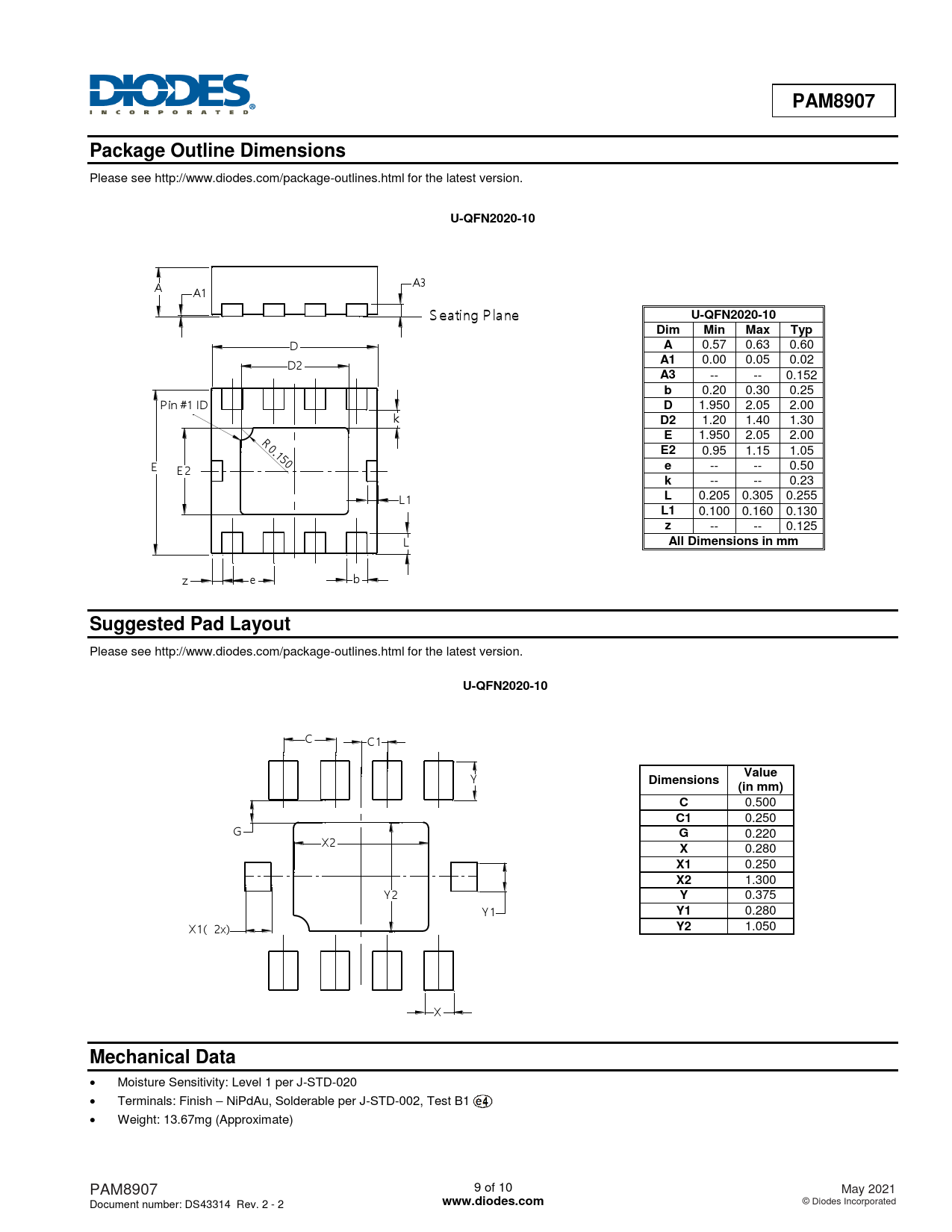 PAM8907. Package Outline Dimensions. U-QFN2020-10. Dim. Min. Max. Typ. All Dimensions in mm. A V. Suggested Pad Layout. Value. Dimensions