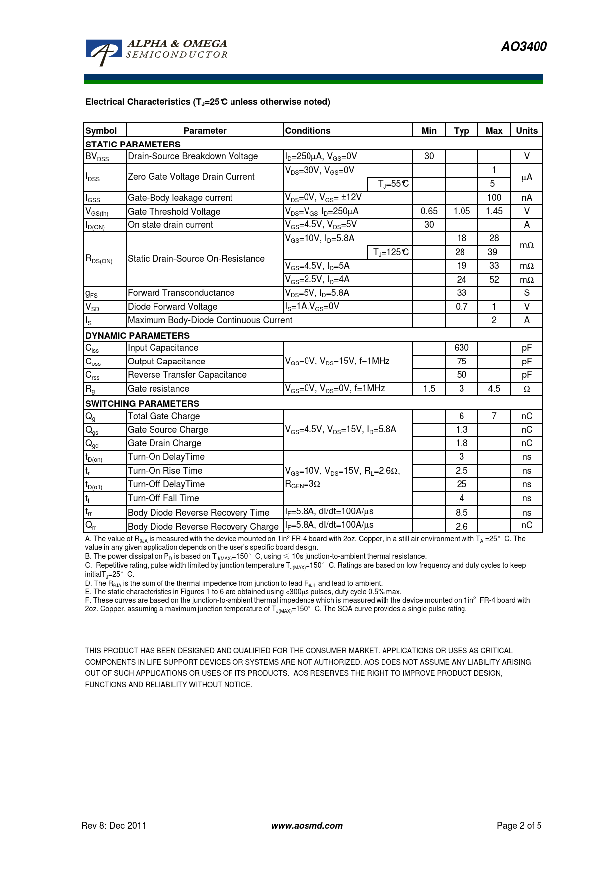 Qg Total Gate Charge 6 7 nC Q Gate Source Charge V gs GS=4.5V, VDS=15V, ID=5.8A 1.3 nC Qgd Gate Drain Charge 1.8 nC tD(on) Turn-On DelayTime 3 ns t Tu T r u n- n On O n Ri R se e Ti T me r m V =10V, V =15V, R =2.6 GS=10V, VDS=15V, RL=2. Ω 6 , 2. 2 5 ns n t R D(off) Turn-Off DelayTime GEN=3Ω 25 ns tf Turn-Off Fall Time 4 ns trr IF=5.8A, dI/dt=100A/µs Body Diode Reverse Recovery Time 8.5 ns Qrr Body Diode Reverse Recovery Charge IF=5.8A, dI/dt=100A/µs 2.6 nC A. The value of Rθ is measured with the device mounted on 1in2 FR-4 board with 2oz. Copper, in a still air environment with T =25 C. The JA A ° value in any given application depends on the user's specific board design. B. The power dissipation P is based on T =150 C, using 10s junction-to-ambient thermal resistance. D J(MAX) ° ≤ C. Repetitive rating, pulse width limited by junction temperature T =150 C. Ratings are based on low frequency and duty cycles to keep J(MAX) ° initialT =25 C. J ° D. The Rθ is the sum of the thermal impedence from junction to lead R and lead to ambient. JA θJL E. The static characteristics in Figures 1 to 6 are obtained using <300µs pulses, duty cycle 0.5% max. F. These curves are based on the junction-to-ambient thermal impedence which is measured with the device mounted on 1in2 FR-4 board with 2oz. Copper, assuming a maximum junction temperature of T =150 C. The SOA curve provides a single pulse rating. J(MAX) ° THIS PRODUCT HAS BEEN DESIGNED AND QUALIFIED FOR THE CONSUMER MARKET. APPLICATIONS OR USES AS CRITICAL COMPONENTS IN LIFE SUPPORT DEVICES OR SYSTEMS ARE NOT AUTHORIZED. AOS DOES NOT ASSUME ANY LIABILITY ARISING OUT OF SUCH APPLICATIONS OR USES OF ITS PRODUCTS. AOS RESERVES THE RIGHT TO IMPROVE PRODUCT DESIGN, FUNCTIONS AND RELIABILITY WITHOUT NOTICE. Rev 8: Dec 2011