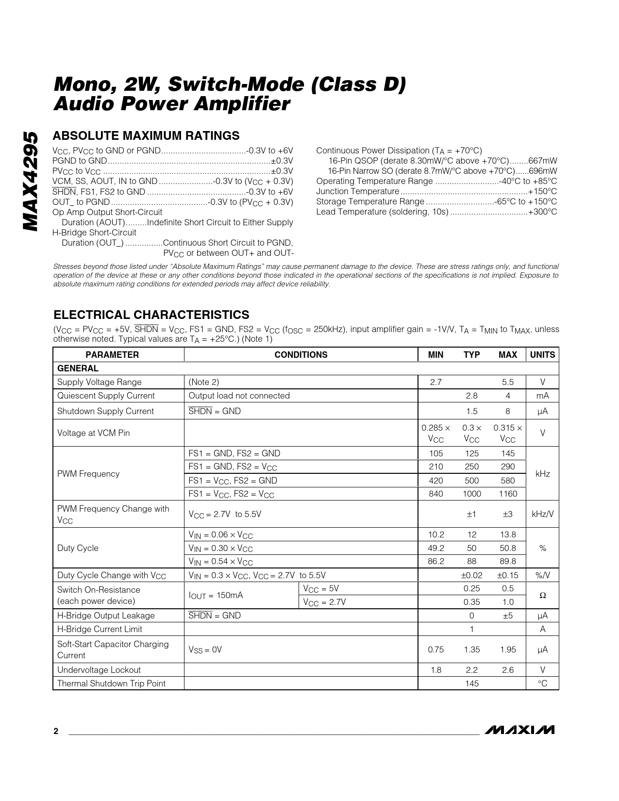 Mono, 2W, Switch-Mode (Class D) Audio Power Amplifier ABSOLUTE MAXIMUM RATINGS MAX4295 ELECTRICAL CHARACTERISTICS PARAMETER