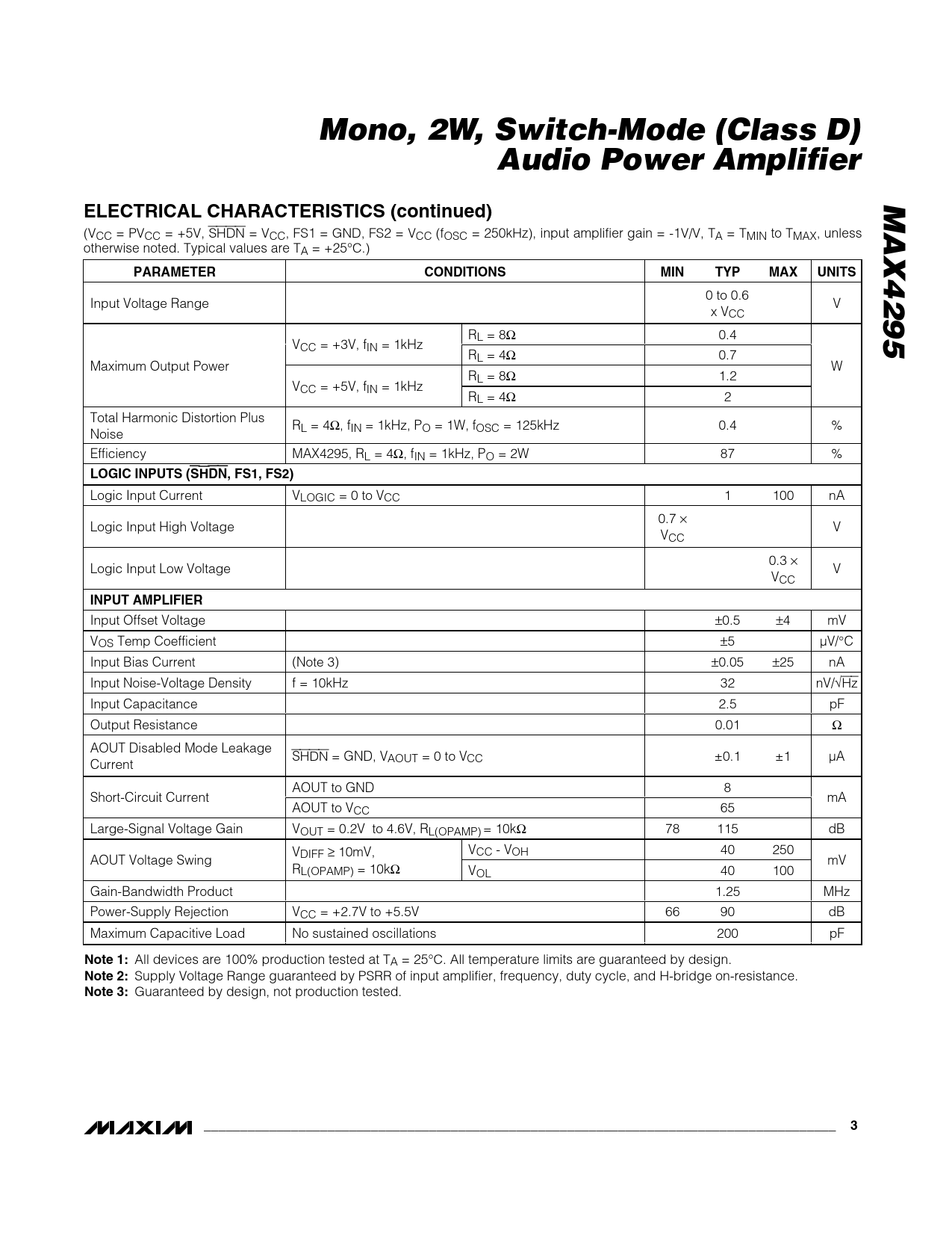 Mono, 2W, Switch-Mode (Class D). Audio Power Amplifier. MAX4295. ELECTRICAL CHARACTERISTICS (continued). PARAMETER. CONDITIONS. MIN