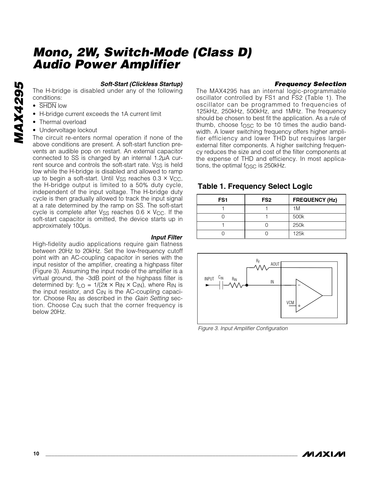 Mono, 2W, Switch-Mode (Class D) Audio Power AmplifierSoft-Start (Clickless Startup)Frequency Selection The H-bridge is disabled under any of the following The MAX4295 has an internal logic-programmable conditions: oscillator controlled by FS1 and FS2 (Table 1). The • SHDN low oscillator can be programmed to frequencies of • H-bridge current exceeds the 1A current limit 125kHz, 250kHz, 500kHz, and 1MHz. The frequency should be chosen to best fit the application. As a rule of • Thermal overload thumb, choose fOSC to be 10 times the audio band- • Undervoltage lockout width. A lower switching frequency offers higher ampli- The circuit re-enters normal operation if none of the fier efficiency and lower THD but requires larger MAX4295 above conditions are present. A soft-start function pre- external filter components. A higher switching frequen- vents an audible pop on restart. An external capacitor cy reduces the size and cost of the filter components at connected to SS is charged by an internal 1.2µA cur- the expense of THD and efficiency. In most applica- rent source and controls the soft-start rate. VSS is held tions, the optimal fOSC is 250kHz. low while the H-bridge is disabled and allowed to ramp up to begin a soft-start. Until VSS reaches 0.3 ✕ VCC, the H-bridge output is limited to a 50% duty cycle, Table 1. Frequency Select Logic independent of the input voltage. The H-bridge duty cycle is then gradually allowed to track the input signal FS1FS2FREQUENCY (Hz) at a rate determined by the ramp on SS. The soft-start 1 1 1M cycle is complete after VSS reaches 0.6 ✕ VCC. If the soft-start capacitor is omitted, the device starts up in 0 1 500k approximately 100µs. 1 0 250k 0 0 125k Input Filter High-fidelity audio applications require gain flatness between 20Hz to 20kHz. Set the low-frequency cutoff point with an AC-coupling capacitor in series with the R input resistor of the amplifier, creating a highpass filter F AOUT (Figure 3). Assuming the input node of the amplifier is a virtual ground, the -3dB point of the highpass filter is INPUT CIN RIN IN determined by: fLO = 1/(2π ✕ RIN ✕ CIN), where RIN is the input resistor, and CIN is the AC-coupling capaci- tor. Choose RIN as described in the Gain Setting sec- tion. Choose C VCM IN such that the corner frequency is below 20Hz. Figure 3. Input Amplifier Configuration 10______________________________________________________________________________________