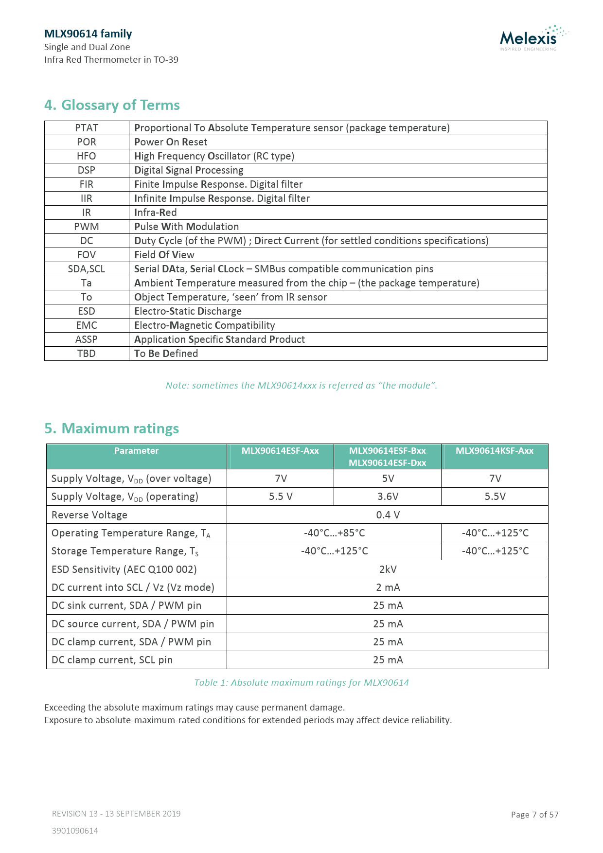 Pages / Page57 / 7 — MLX90614 family. 4. Glossary of Terms. 5. Maximum ratings. Parameter. …