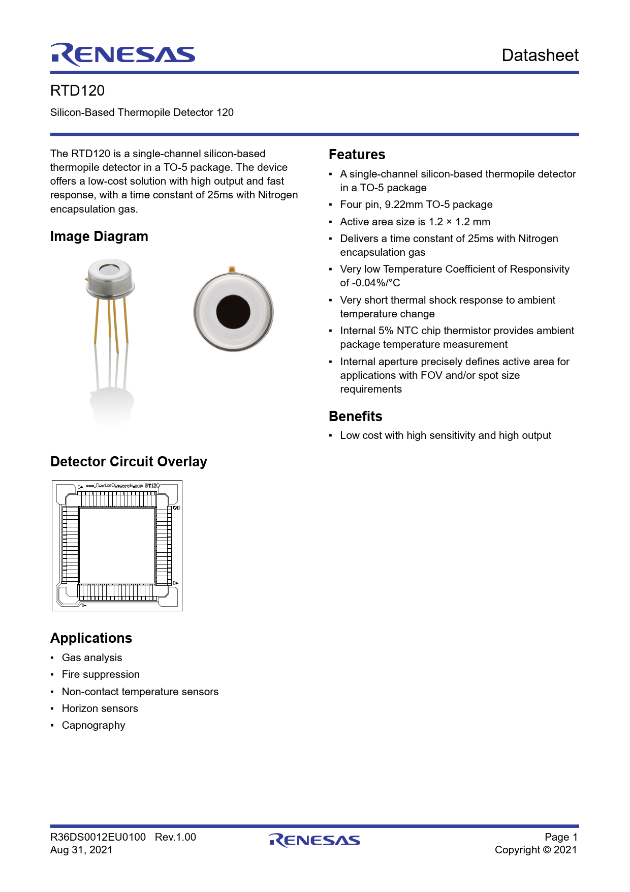 ▪ Gas analysis ▪ Fire suppression ▪ Non-contact temperature sensors ▪ Horizon sensors ▪ Capnography R36DS0012EU0100 Rev.1.00 Page 1 Aug 31, 2021 Copyright © 2021 Document Outline Image Diagram Detector Circuit Overlay Applications Features Benefits 1. Specifications 2. Package Outline Drawings 3. Ordering Information 4. Revision History