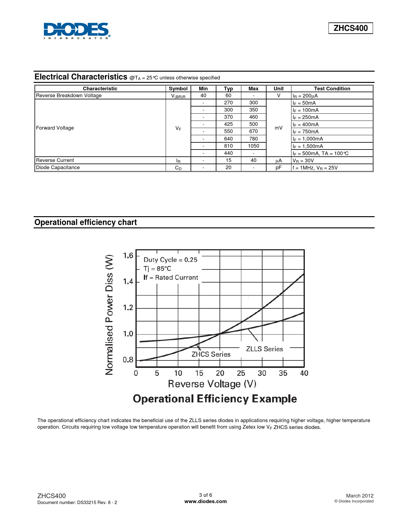 The operational efficiency chart indicates the beneficial use of the ZLLS series diodes in applications requiring higher voltage, higher temperature operation. Circuits requiring low voltage low temperature operation will benefit from using Zetex low VF ZHCS series diodes. ZHCS400 3 of 6 March 2012 Document number: DS33215 Rev. 8 - 2