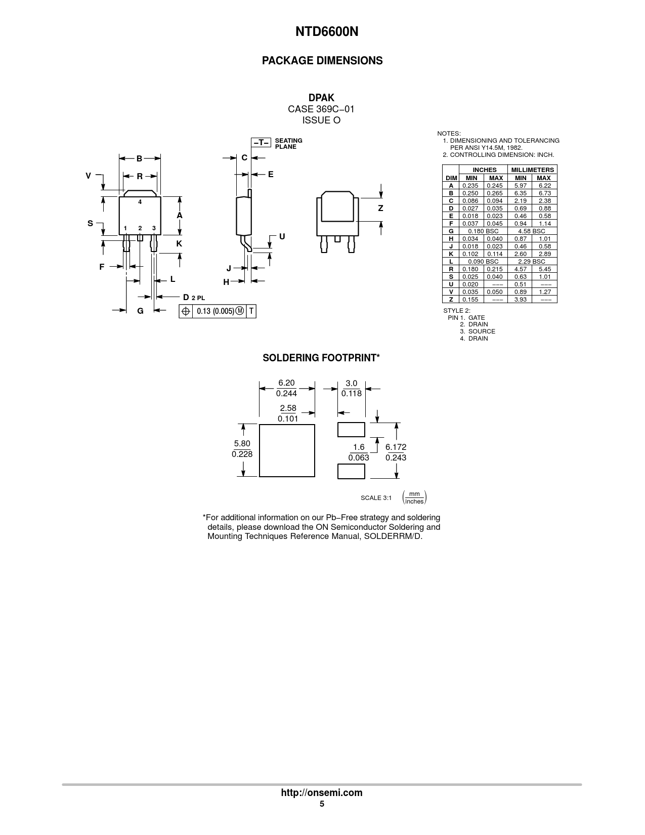 NTD6600N. PACKAGE DIMENSIONS. DPAK. −T− SEATING. PLANE. INCHES. MILLIMETERS. DIM. MIN. MAX. D 2 PL. SOLDERING FOOTPRINT*. http://onsemi.com