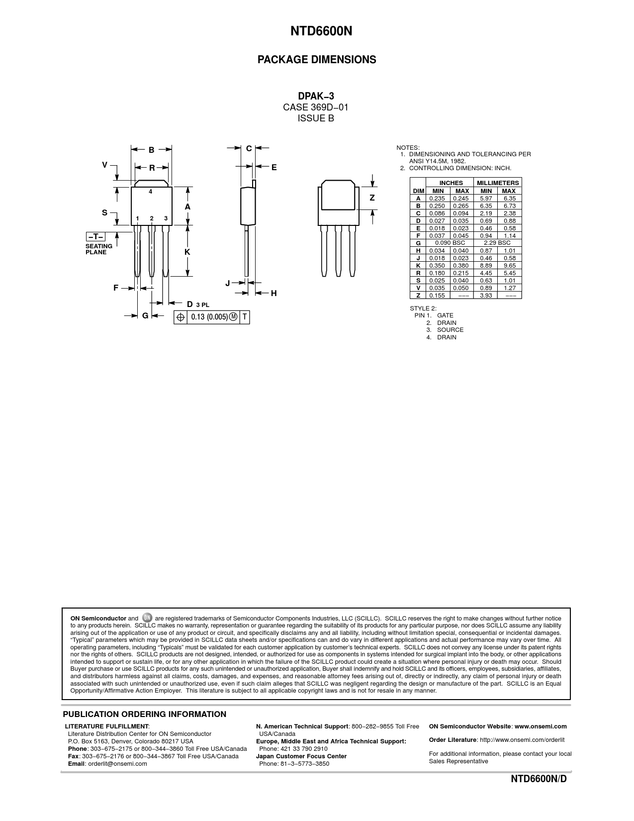 NTD6600N PACKAGE DIMENSIONS DPAK−3 INCHES MILLIMETERS DIM MIN MAX −T− SEATING PLANE D 3 PL ON Semiconductor