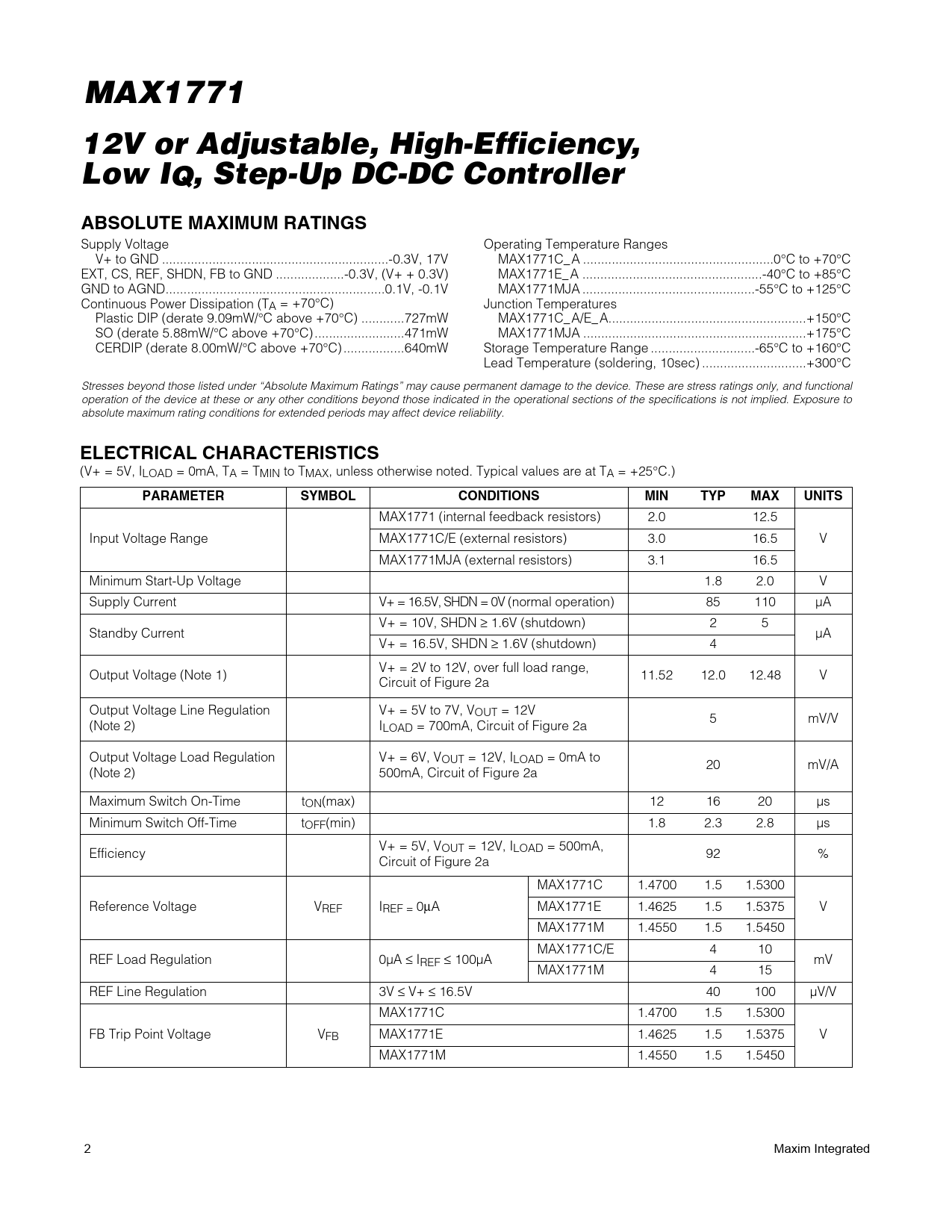 MAX1771 12V or Adjustable, High-Efficiency, Low IQ, Step-Up DC-DC ControllerABSOLUTE MAXIMUM RATINGS Supply Voltage Operating Temperature Ranges V+ to GND ...-0.3V, 17V MAX1771C_ A ...0°C to +70°C EXT, CS, REF, SHDN, FB to GND ...-0.3V, (V+ + 0.3V) MAX1771E_ A ..-40°C to +85°C GND to AGND...0.1V, -0.1V MAX1771MJA ..-55°C to +125°C Continuous Power Dissipation (TA = +70°C) Junction Temperatures Plastic DIP (derate 9.09mW/°C above +70°C) ..727mW MAX1771C_ A/E_ A...+150°C SO (derate 5.88mW/°C above +70°C) ...471mW MAX1771MJA ..+175°C CERDIP (derate 8.00mW/°C above +70°C) ...640mW Storage Temperature Range ...-65°C to +160°C Lead Temperature (soldering, 10sec) ...+300°C Stresses beyond those listed under “Absolute Maximum Ratings” may cause permanent damage to the device. These are stress ratings only, and functional operation of the device at these or any other conditions beyond those indicated in the operational sections of the specifications is not implied. Exposure to absolute maximum rating conditions for extended periods may affect device reliability. ELECTRICAL CHARACTERISTICS (V+ = 5V, ILOAD = 0mA, TA = TMIN to TMAX, unless otherwise noted. Typical values are at TA = +25°C.) PARAMETERSYMBOLCONDITIONSMINTYPMAXUNITS MAX1771 (internal feedback resistors) 2.0 12.5 Input Voltage Range MAX1771C/E (external resistors) 3.0 16.5 V MAX1771MJA (external resistors) 3.1 16.5 Minimum Start-Up Voltage 1.8 2.0 V Supply Current V+ = 16.5V, SHDN = 0V (normal operation) 85 110 µA V+ = 10V, SHDN ≥ 1.6V (shutdown) 2 5 Standby Current µA V+ = 16.5V, SHDN ≥ 1.6V (shutdown) 4 V+ = 2V to 12V, over full load range, Output Voltage (Note 1) 11.52 12.0 12.48 V Circuit of Figure 2a Output Voltage Line Regulation V+ = 5V to 7V, VOUT = 12V 5 mV/V (Note 2) ILOAD = 700mA, Circuit of Figure 2a Output Voltage Load Regulation V+ = 6V, VOUT = 12V, ILOAD = 0mA to 20 mV/A (Note 2) 500mA, Circuit of Figure 2a Maximum Switch On-Time tON(max) 12 16 20 µs Minimum Switch Off-Time tOFF(min) 1.8 2.3 2.8 µs V+ = 5V, VOUT = 12V, ILOAD = 500mA, Efficiency 92 % Circuit of Figure 2a MAX1771C 1.4700 1.5 1.5300 Reference Voltage VREF IREF = 0µA MAX1771E 1.4625 1.5 1.5375 V MAX1771M 1.4550 1.5 1.5450 MAX1771C/E 4 10 REF Load Regulation 0µA ≤ IREF ≤ 100µA mV MAX1771M 4 15 REF Line Regulation 3V ≤ V+ ≤ 16.5V 40 100 µV/V MAX1771C 1.4700 1.5 1.5300 FB Trip Point Voltage VFB MAX1771E 1.4625 1.5 1.5375 V MAX1771M 1.4550 1.5 1.5450 2 Maxim Integrated