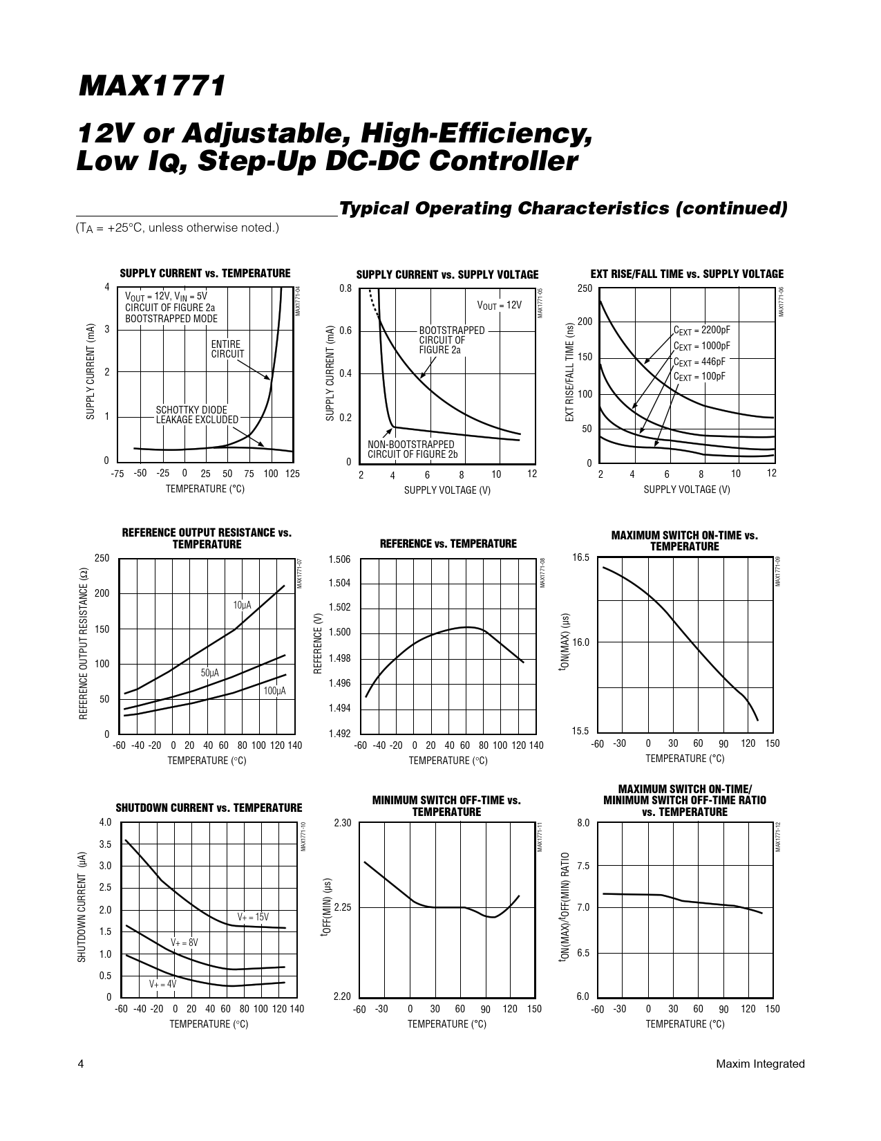 4 0.8 250 VOUT = 12V, VIN = 5V CIRCUIT OF FIGURE 2a VOUT = 12V MAX1771-04 BOOTSTRAPPED MODE MAX1771-05 MAX1771-06 200 3 0.6 BOOTSTRAPPED CEXT = 2200pF ENTIRE CIRCUIT OF CEXT = 1000pF CIRCUIT FIGURE 2a 150 CEXT = 446pF 2 0.4 CEXT = 100pF 100 SCHOTTKY DIODE SUPPLY CURRENT (mA) 1 LEAKAGE EXCLUDED SUPPLY CURRENT (mA) 0.2 EXT RISE/FALL TIME (ns) 50 NON-BOOTSTRAPPED CIRCUIT OF FIGURE 2b 0 0 0 -75 -50 -25 0 25 50 75 100 125 2 4 6 8 10 12 2 4 6 8 10 12 TEMPERATURE (°C) SUPPLY VOLTAGE (V) SUPPLY VOLTAGE (V)