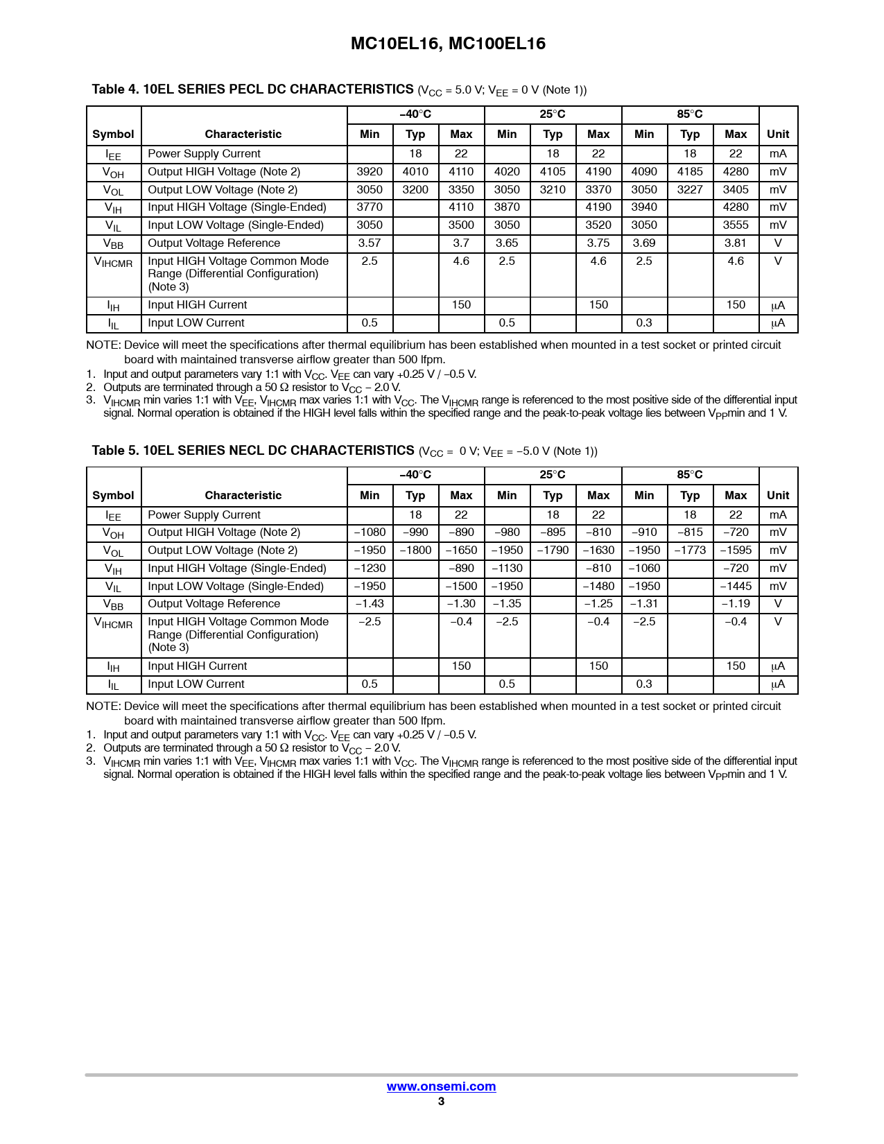 IEE Power Supply Current 18 22 18 22 18 22 mA VOH Output HIGH Voltage (Note 2) 3920 4010 4110 4020 4105 4190 4090 4185 4280 mV VOL Output LOW Voltage (Note 2) 3050 3200 3350 3050 3210 3370 3050 3227 3405 mV VIH Input HIGH Voltage (Single-Ended) 3770 4110 3870 4190 3940 4280 mV VIL Input LOW Voltage (Single-Ended) 3050 3500 3050 3520 3050 3555 mV VBB Output Voltage Reference 3.57 3.7 3.65 3.75 3.69 3.81 V VIHCMR Input HIGH Voltage Common Mode 2.5 4.6 2.5 4.6 2.5 4.6 V Range (Differential Configuration) (Note 3) IIH Input HIGH Current 150 150 150 mA IIL Input LOW Current 0.5 0.5 0.3 mA NOTE: Device will meet the specifications after thermal equilibrium has been established when mounted in a test socket or printed circuit board with maintained transverse airflow greater than 500 lfpm. 1. Input and output parameters vary 1:1 with VCC. VEE can vary +0.25 V / −0.5 V. 2. Outputs are terminated through a 50 W resistor to VCC − 2.0 V. 3. VIHCMR min varies 1:1 with VEE, VIHCMR max varies 1:1 with VCC. The VIHCMR range is referenced to the most positive side of the dif erential input signal. Normal operation is obtained if the HIGH level falls within the specified range and the peak-to-peak voltage lies between VPPmin and 1 V.