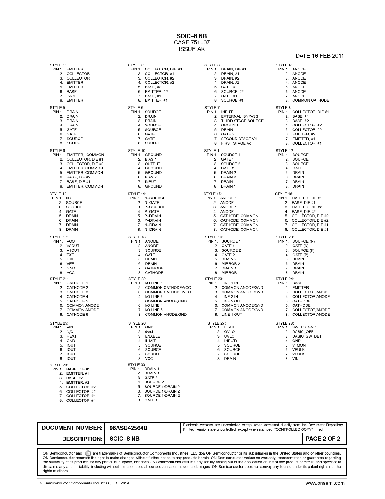 CASE 751−07 ISSUE AK DATE 16 FEB 2011 STYLE 1: STYLE 2: STYLE 3: STYLE 4: PIN 1. EMITTER PIN 1. COLLECTOR, DIE, #1 PIN 1. DRAIN, DIE #1 PIN 1. ANODE 2. COLLECTOR 2. COLLECTOR, #1 2. DRAIN, #1 2. ANODE 3. COLLECTOR 3. COLLECTOR, #2 3. DRAIN, #2 3. ANODE 4. EMITTER 4. COLLECTOR, #2 4. DRAIN, #2 4. ANODE 5. EMITTER 5. BASE, #2 5. GATE, #2 5. ANODE 6. BASE 6. EMITTER, #2 6. SOURCE, #2 6. ANODE 7. BASE 7. BASE, #1 7. GATE, #1 7. ANODE 8. EMITTER 8. EMITTER, #1 8. SOURCE, #1 8. COMMON CATHODE STYLE 5: STYLE 6: STYLE 7: STYLE 8: PIN 1. DRAIN PIN 1. SOURCE PIN 1. INPUT PIN 1. COLLECTOR, DIE #1 2. DRAIN 2. DRAIN 2. EXTERNAL BYPASS 2. BASE, #1 3. DRAIN 3. DRAIN 3. THIRD STAGE SOURCE 3. BASE, #2 4. DRAIN 4. SOURCE 4. GROUND 4. COLLECTOR, #2 5. GATE 5. SOURCE 5. DRAIN 5. COLLECTOR, #2 6. GATE 6. GATE 6. GATE 3 6. EMITTER, #2 7. SOURCE 7. GATE 7. SECOND STAGE Vd 7. EMITTER, #1 8. SOURCE 8. SOURCE 8. FIRST STAGE Vd 8. COLLECTOR, #1 STYLE 9: STYLE 10: STYLE 11: STYLE 12: PIN 1. EMITTER, COMMON PIN 1. GROUND PIN 1. SOURCE 1 PIN 1. SOURCE 2. COLLECTOR, DIE #1 2. BIAS 1 2. GATE 1 2. SOURCE 3. COLLECTOR, DIE #2 3. OUTPUT 3. SOURCE 2 3. SOURCE 4. EMITTER, COMMON 4. GROUND 4. GATE 2 4. GATE 5. EMITTER, COMMON 5. GROUND 5. DRAIN 2 5. DRAIN 6. BASE, DIE #2 6. BIAS 2 6. DRAIN 2 6. DRAIN 7. BASE, DIE #1 7. INPUT 7. DRAIN 1 7. DRAIN 8. EMITTER, COMMON 8. GROUND 8. DRAIN 1 8. DRAIN STYLE 13: STYLE 14: STYLE 15: STYLE 16: PIN 1. N.C. PIN 1. N−SOURCE PIN 1. ANODE 1 PIN 1. EMITTER, DIE #1 2. SOURCE 2. N−GATE 2. ANODE 1 2. BASE, DIE #1 3. SOURCE 3. P−SOURCE 3. ANODE 1 3. EMITTER, DIE #2 4. GATE 4. P−GATE 4. ANODE 1 4. BASE, DIE #2 5. DRAIN 5. P−DRAIN 5. CATHODE, COMMON 5. COLLECTOR, DIE #2 6. DRAIN 6. P−DRAIN 6. CATHODE, COMMON 6. COLLECTOR, DIE #2 7. DRAIN 7. N−DRAIN 7. CATHODE, COMMON 7. COLLECTOR, DIE #1 8. DRAIN 8. N−DRAIN 8. CATHODE, COMMON 8. COLLECTOR, DIE #1 STYLE 17: STYLE 18: STYLE 19: STYLE 20: PIN 1. VCC PIN 1. ANODE PIN 1. SOURCE 1 PIN 1. SOURCE (N) 2. V2OUT 2. ANODE 2. GATE 1 2. GATE (N) 3. V1OUT 3. SOURCE 3. SOURCE 2 3. SOURCE (P) 4. TXE 4. GATE 4. GATE 2 4. GATE (P) 5. RXE 5. DRAIN 5. DRAIN 2 5. DRAIN 6. VEE 6. DRAIN 6. MIRROR 2 6. DRAIN 7. GND 7. CATHODE 7. DRAIN 1 7. DRAIN 8. ACC 8. CATHODE 8. MIRROR 1 8. DRAIN STYLE 21: STYLE 22: STYLE 23: STYLE 24: PIN 1. CATHODE 1 PIN 1. I/O LINE 1 PIN 1. LINE 1 IN PIN 1. BASE 2. CATHODE 2 2. COMMON CATHODE/VCC 2. COMMON ANODE/GND 2. EMITTER 3. CATHODE 3 3. COMMON CATHODE/VCC 3. COMMON ANODE/GND 3. COLLECTOR/ANODE 4. CATHODE 4 4. I/O LINE 3 4. LINE 2 IN 4. COLLECTOR/ANODE 5. CATHODE 5 5. COMMON ANODE/GND 5. LINE 2 OUT 5. CATHODE 6. COMMON ANODE 6. I/O LINE 4 6. COMMON ANODE/GND 6. CATHODE 7. COMMON ANODE 7. I/O LINE 5 7. COMMON ANODE/GND 7. COLLECTOR/ANODE 8. CATHODE 6 8. COMMON ANODE/GND 8. LINE 1 OUT 8. COLLECTOR/ANODE STYLE 25: STYLE 26: STYLE 27: STYLE 28: PIN 1. VIN PIN 1. GND PIN 1. ILIMIT PIN 1. SW_TO_GND 2. N/C 2. dv/dt 2. OVLO 2. DASIC_OFF 3. REXT 3. ENABLE 3. UVLO 3. DASIC_SW_DET 4. GND 4. ILIMIT 4. INPUT+ 4. GND 5. IOUT 5. SOURCE 5. SOURCE 5. V_MON 6. IOUT 6. SOURCE 6. SOURCE 6. VBULK 7. IOUT 7. SOURCE 7. SOURCE 7. VBULK 8. IOUT 8. VCC 8. DRAIN 8. VIN STYLE 29: STYLE 30: PIN 1. BASE, DIE #1 PIN 1. DRAIN 1 2. EMITTER, #1 2. DRAIN 1 3. BASE, #2 3. GATE 2 4. EMITTER, #2 4. SOURCE 2 5. COLLECTOR, #2 5. SOURCE 1/DRAIN 2 6. COLLECTOR, #2 6. SOURCE 1/DRAIN 2 7. COLLECTOR, #1 7. SOURCE 1/DRAIN 2 8. COLLECTOR, #1 8. GATE 1