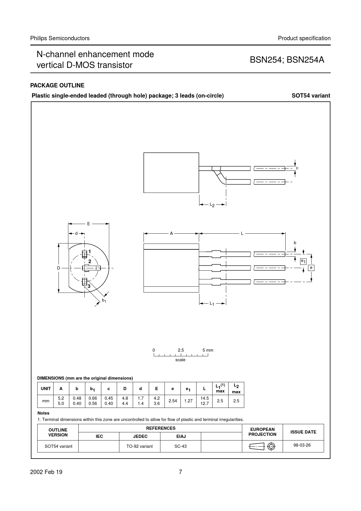 Philips Semiconductors Product specification N-channel enhancement mode BSN254; BSN254A vertical D-MOS transistor PACKAGE OUTLINEPlastic single-ended leaded (through hole) package; 3 leads (on-circle)SOT54 variant c L2 E d A L b 12 e1 D e 3 b1 L1 0 2.5 5 mm scale DIMENSIONS (mm are the original dimensions)L (1)LUNIT2AbbcDdEeeL111maxmax 5.2 0.48 0.66 0.45 4.8 1.7 4.2 14.5 mm 2.54 1.27 2.5 2.5 5.0 0.40 0.56 0.40 4.4 1.4 3.6 12.7 Notes 1. Terminal dimensions within this zone are uncontrolled to allow for flow of plastic and terminal irregularities. REFERENCESOUTLINEEUROPEANISSUE DATEVERSIONPROJECTIONIECJEDECEIAJ SOT54 variant TO-92 variant SC-43 98-03-26 2002 Feb 19 7 Document Outline FEATURES APPLICATIONS DESCRIPTION QUICK REFERENCE DATA PINNING LIMITING VALUES THERMAL CHARACTERISTICS CHARACTERISTICS PACKAGE OUTLINE SOT54 variant DATA SHEET STATUS DEFINITIONS DISCLAIMERS