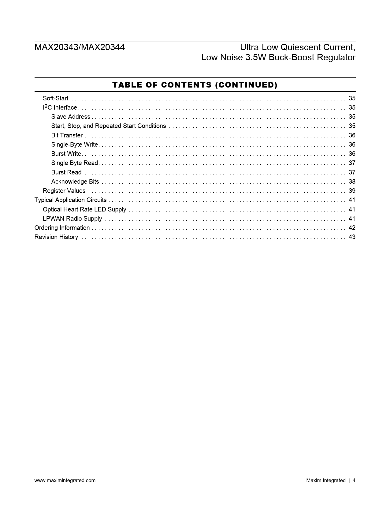 link to page 35 link to page 35 link to page 35 link to page 35 link to page 35 link to page 36 link to page 36 link to page 36 link to page 37 link to page 37 link to page 38 link to page 39 link to page 41 link to page 41 link to page 41 link to page 42 link to page 43 MAX20343/MAX20344 Ultra-Low Quiescent Current, Low Noise 3.5W Buck-Boost Regulator TABLE OF CONTENTS (CONTINUED) Soft-Start . 35 I2C Interface . 35 Slave Address . 35 Start, Stop, and Repeated Start Conditions . 35 Bit Transfer . 36 Single-Byte Write . 36 Burst Write . 36 Single Byte Read . 37 Burst Read . 37 Acknowledge Bits . 38 Register Values . 39 Typical Application Circuits . 41 Optical Heart Rate LED Supply . 41 LPWAN Radio Supply . 41 Ordering Information . 42 Revision History . 43 www.maximintegrated.com Maxim Integrated | 4 Document Outline General Description Applications Benefits and Features Simplified Block Diagram Absolute Maximum Ratings Package Information 16-BUMP WLP 12-Pin FC2QFN Electrical Characteristics Electrical Characteristics (continued) Typical Operating Characteristics Typical Operating Characteristics (continued) Pin Configurations I2C-Controlled WLP Single-Pin-Enabled WLP I2C-Controlled FC2QFN Single-Pin-Enabled FC2QFN Pin Description Pin Description (continued) Functional Diagram Functional Diagram Detailed Description Startup Voltage Architectural Description Switching Phases Buck-Boost Mode Buck-Only Mode Inductor Peak and Valley Current Limits Integrator Control Loop Disable Input Operating Voltage Output Operating Power and Other Optimizations Device Control I2C-Controlled Single-Pin-Enabled Dynamic Voltage Scaling (DVS) RSEL Voltage Setting Register Map MAX20343/MAX20344 Register Details ChipID (0x00) BBstCfg0 (0x01) BBstVSet (0x02) BBstISet (0x03) BBstCfg1 (0x04) Status (0x05) Int (0x06) Mask (0x07) LockMsk (0x50) LockUnlock (0x51) Applications Information Input and Output Capacitance Inductor Selection Soft-Start I2C Interface Slave Address Start, Stop, and Repeated Start Conditions Bit Transfer Single-Byte Write Burst Write Single Byte Read Burst Read Acknowledge Bits Register Values Typical Application Circuits Optical Heart Rate LED Supply LPWAN Radio Supply Ordering Information Revision History
