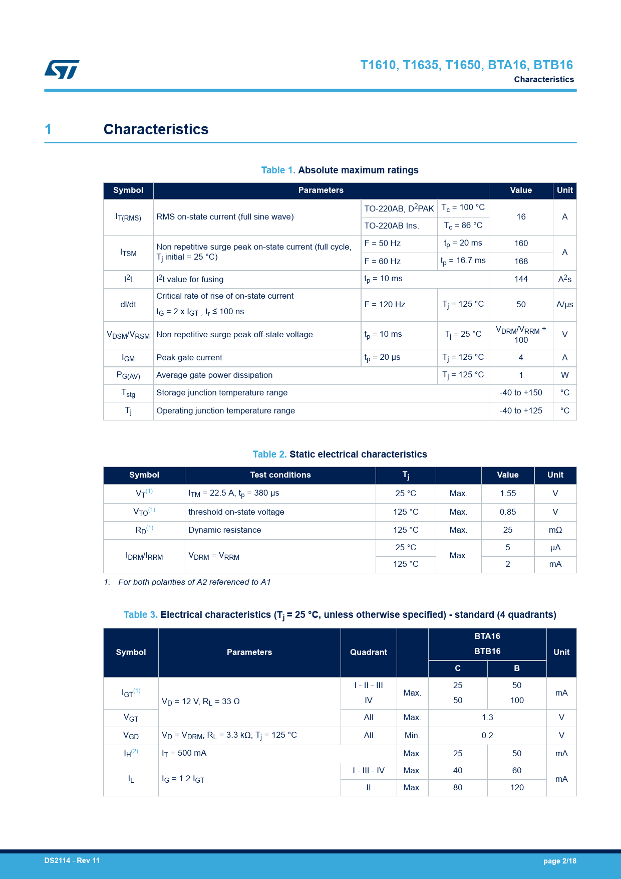 T1610, T1635, T1650, BTA16, BTB16. Characteristics. Table 1. Absolute maximum ratings. Symbol. Parameters. Value. Unit