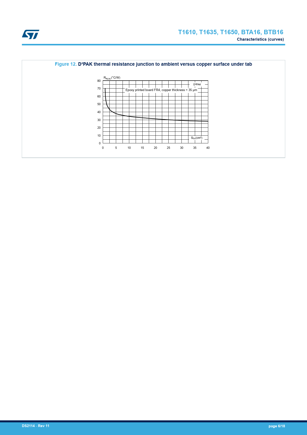 T1610, T1635, T1650, BTA16, BTB16 Characteristics (curves) Figure 12. D²PAK thermal resistance junction to ambient versus copper surface under tab